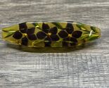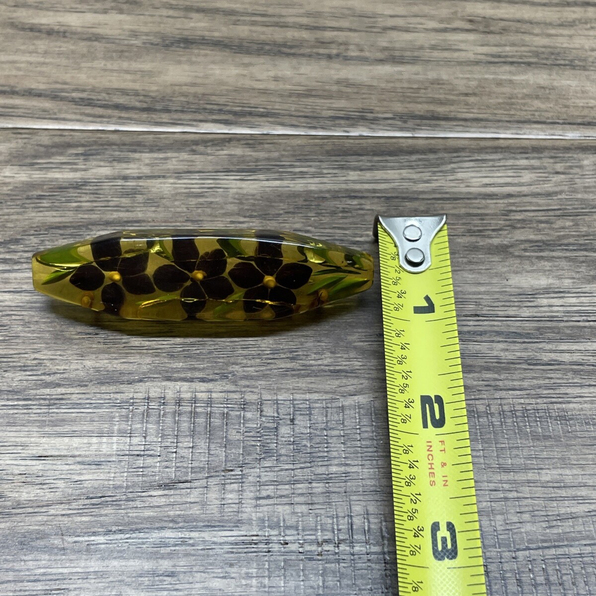 Good wearable condition. Resin is colored yellow with dark flowers. Metal clasp on the back is bent slightly, but still usable. Please see pictures for condition details and measurements.