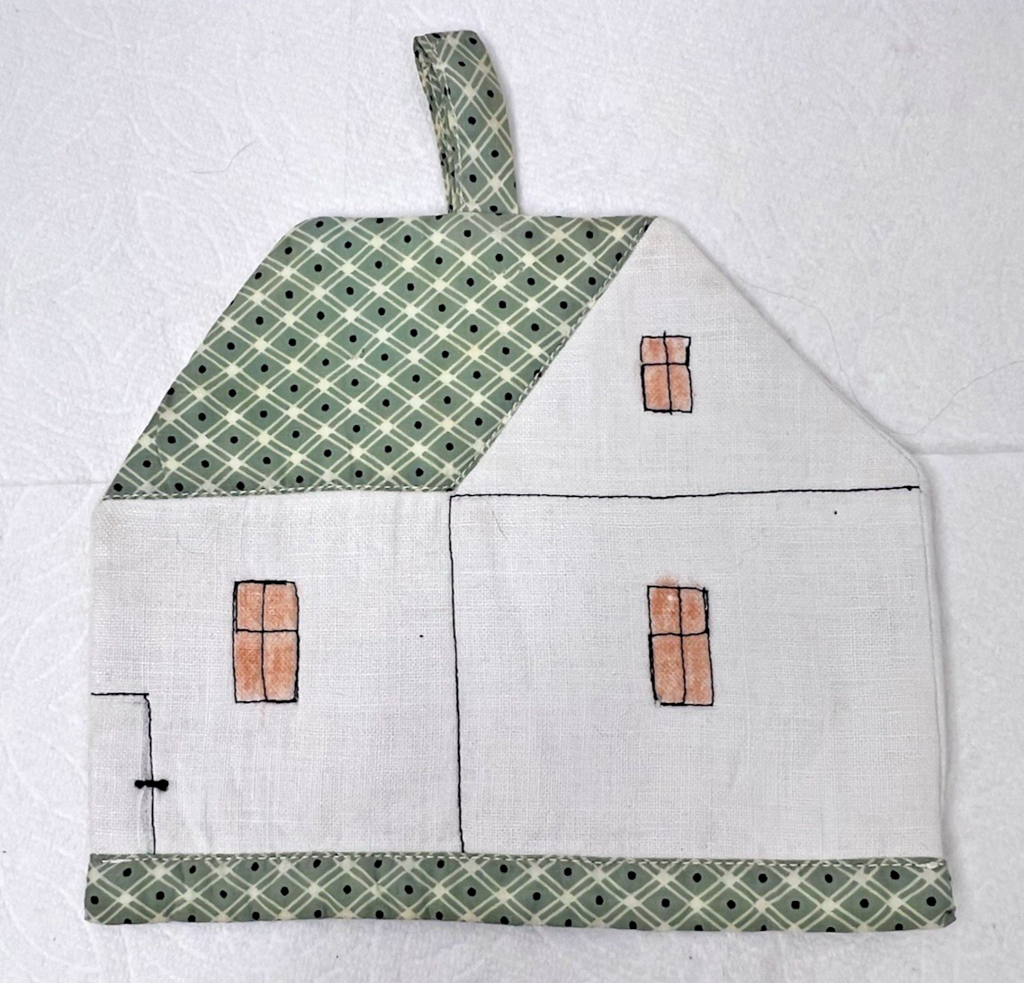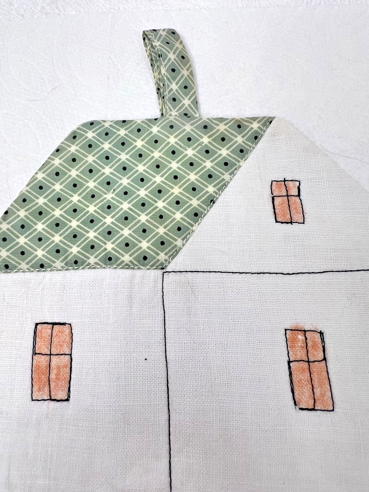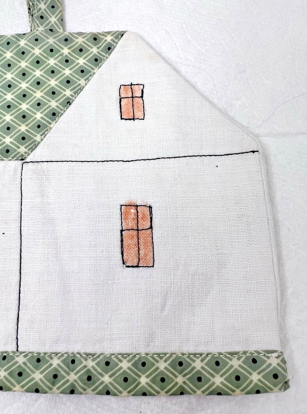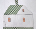 Absolutely charming a little cottage the green is old flour sack material. It does have a few little spots on the back but overall great condition 6 1/4 x 7 including the hanger tab.