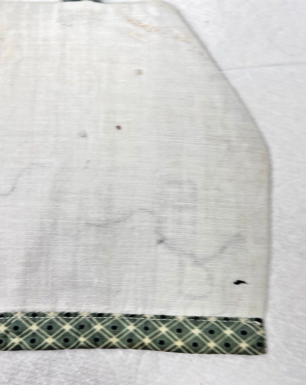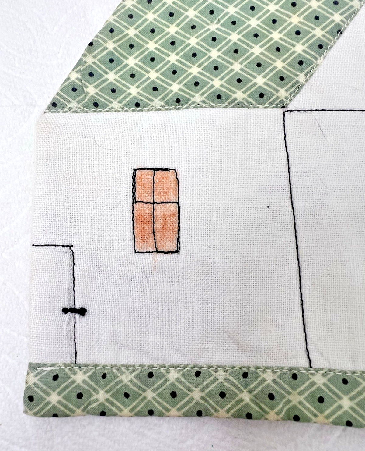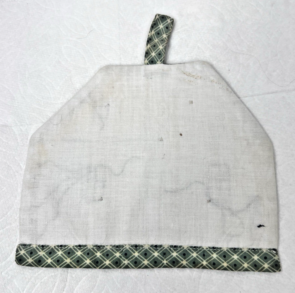 Absolutely charming a little cottage the green is old flour sack material. It does have a few little spots on the back but overall great condition 6 1/4 x 7 including the hanger tab.