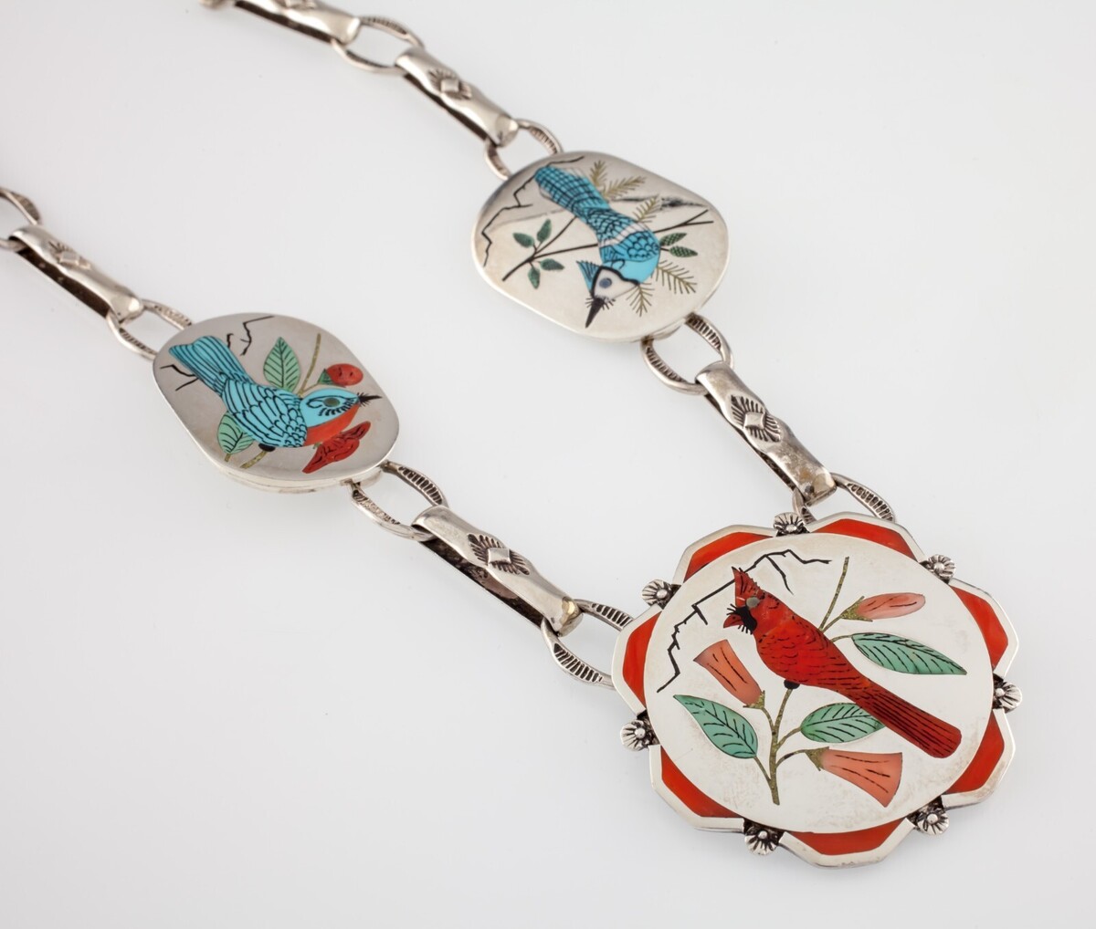 - Vintage Harlan & Monica Coonsis Zuni Turquoise & Coral Bird Sterling Necklace