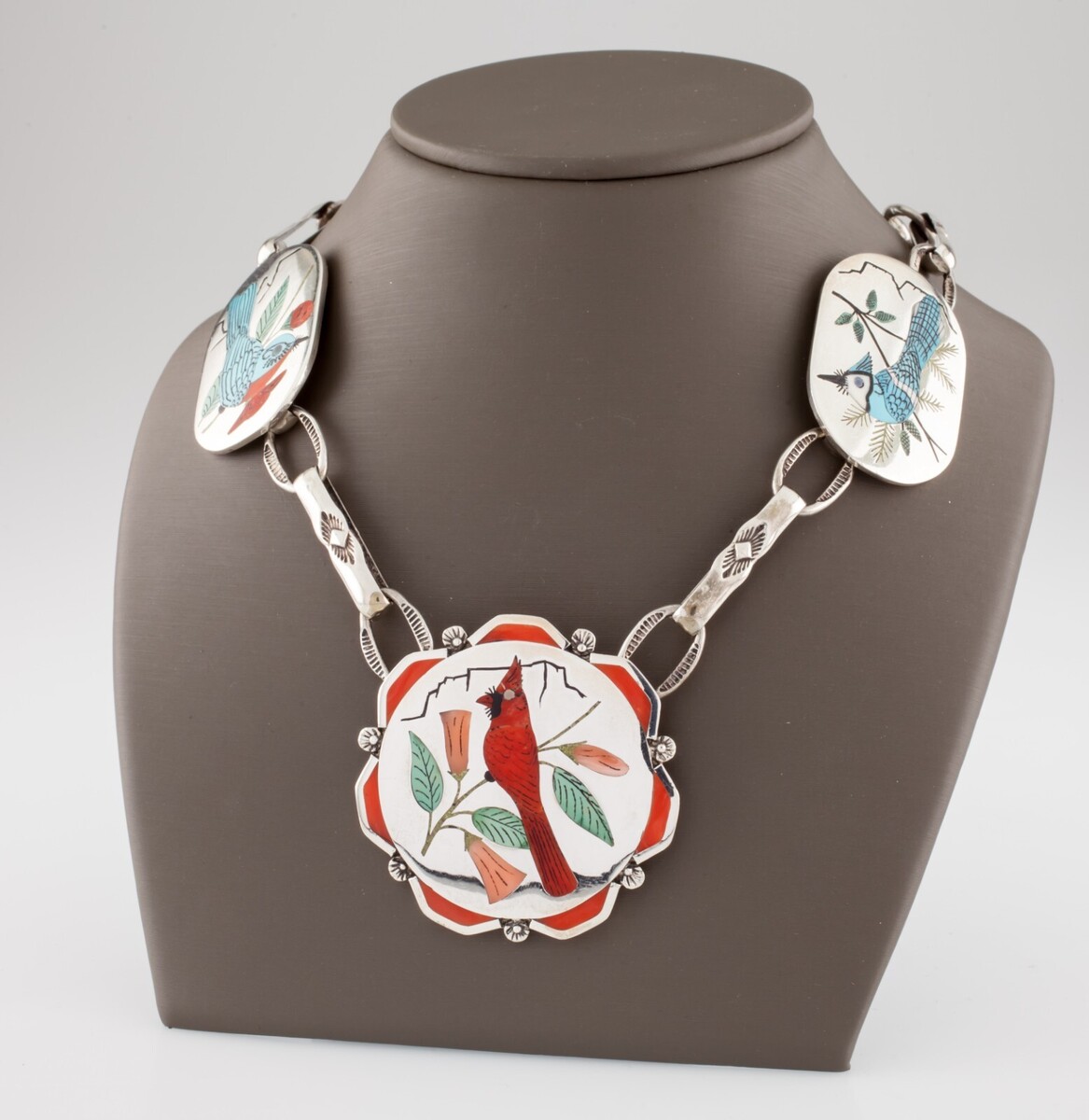 Vintage Harlan & Monica Coonsis Zuni Turquoise & Coral Bird Sterling Necklace