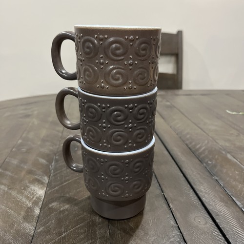 - Vintage Hazel Atlas Hazelware Smoke Milk Glass Scroll & Dots Embossed Mugs (3)