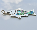 This vintage Mexican Hecho 925 sterling silver pendant features a beautiful fish shape design with natural mother of pearl inlay. The pendant is signed by the maker and showcases intricate details, making it a unique and charming piece of fine jewelry. Made in Mexico, this pendant exudes beauty and elegance with its multicolor mother of pearl shell accents and sterling silver construction, perfect for adding a touch of charm to any outfit.