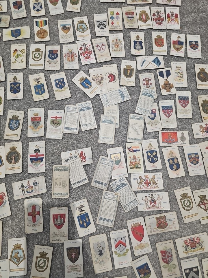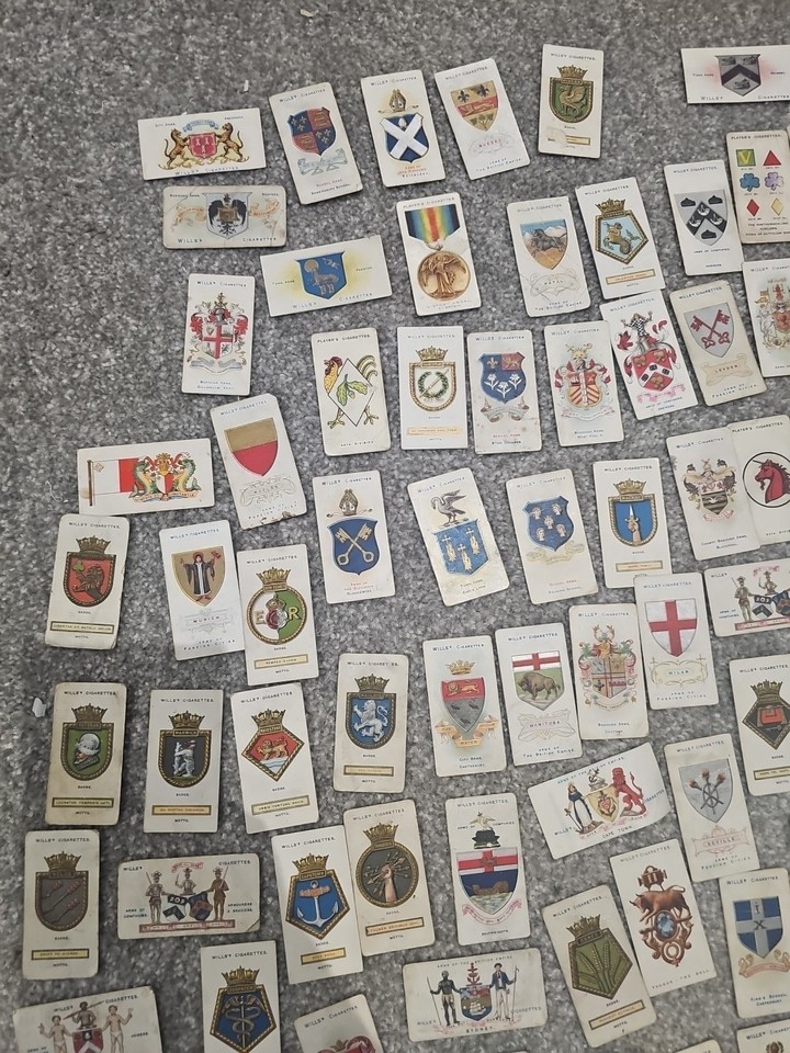 Large collection of over 120+ vintage cigarette cards featuring coats of arms, heraldic shields, and crests. These were issued by Wills's and Player?s Cigarettes in the 1920s?1930s and include a wide variety of: