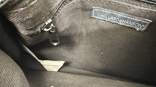 This vintage Hillard Hanson shoulder handbag purse is a stylish addition to any collection. The black faux leather exterior is accented with a strap and silver hardware. The zip closure opens to reveal a black fabric lining with inner and outer pockets for ample storage space. This medium-sized bag is perfect for any occasion and is sure to make a statement.