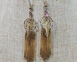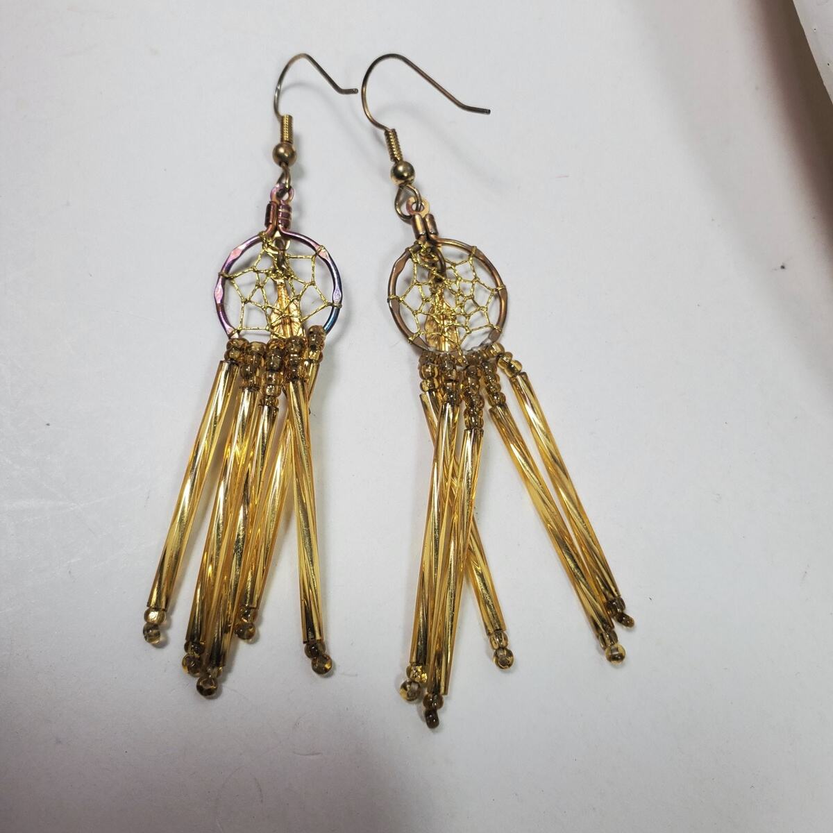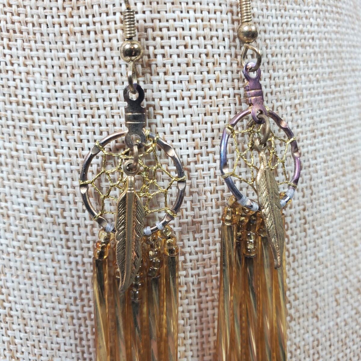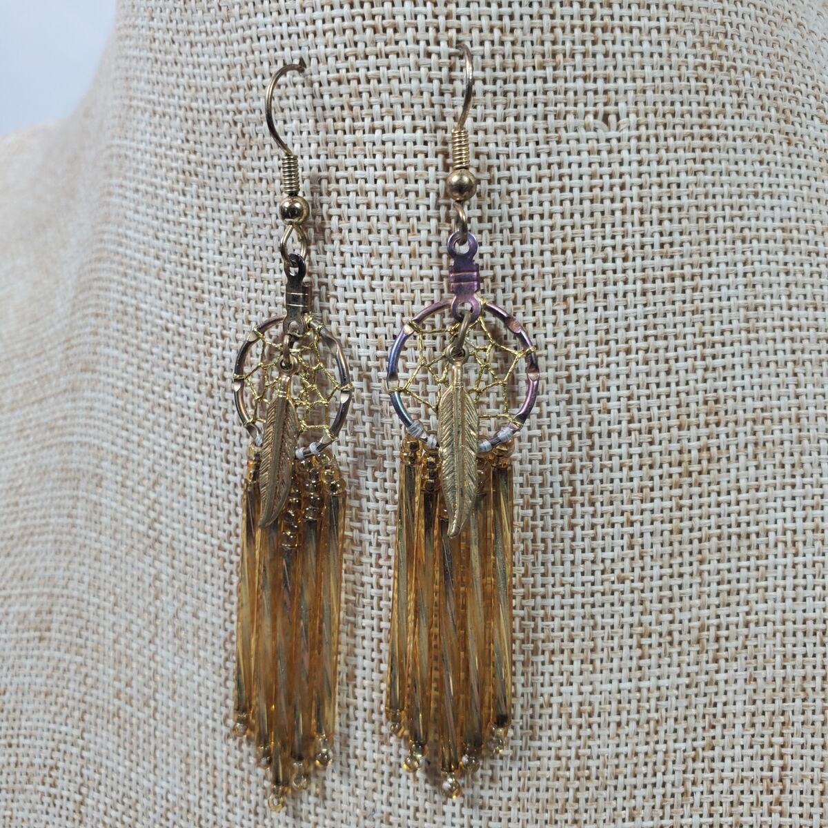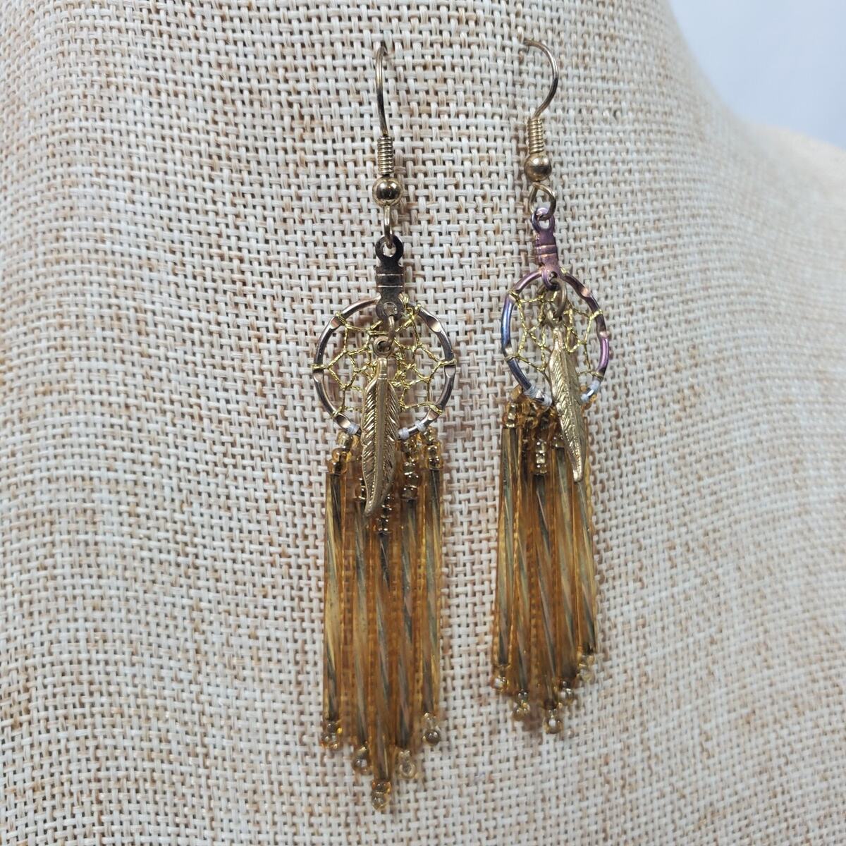 - Vintage Hippie Dream Catcher Feather Earrings Gold Tone 3.5 Inch Dangle Drop