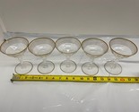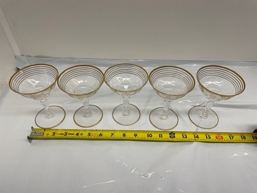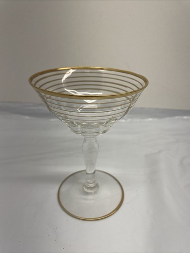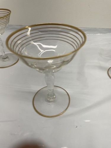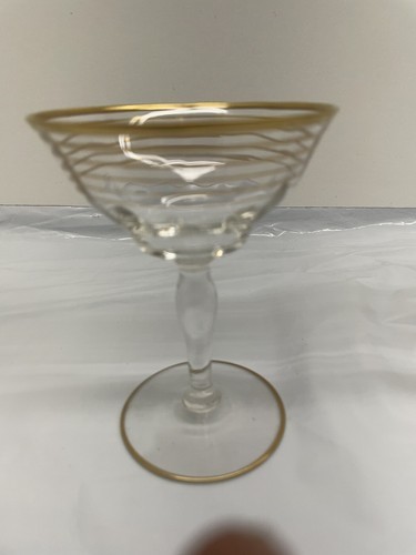 Lot of 5. Elevate your home bar with these vintage Hollywood Regency cocktail glasses. Made of high-quality, clear glass with an art deco style, these glasses feature unique gold band stripes that add a touch of glamour to any drink. Perfect for entertaining or adding a touch of luxury to your own cocktails, these cocktail glasses are a must-have for any home bar.