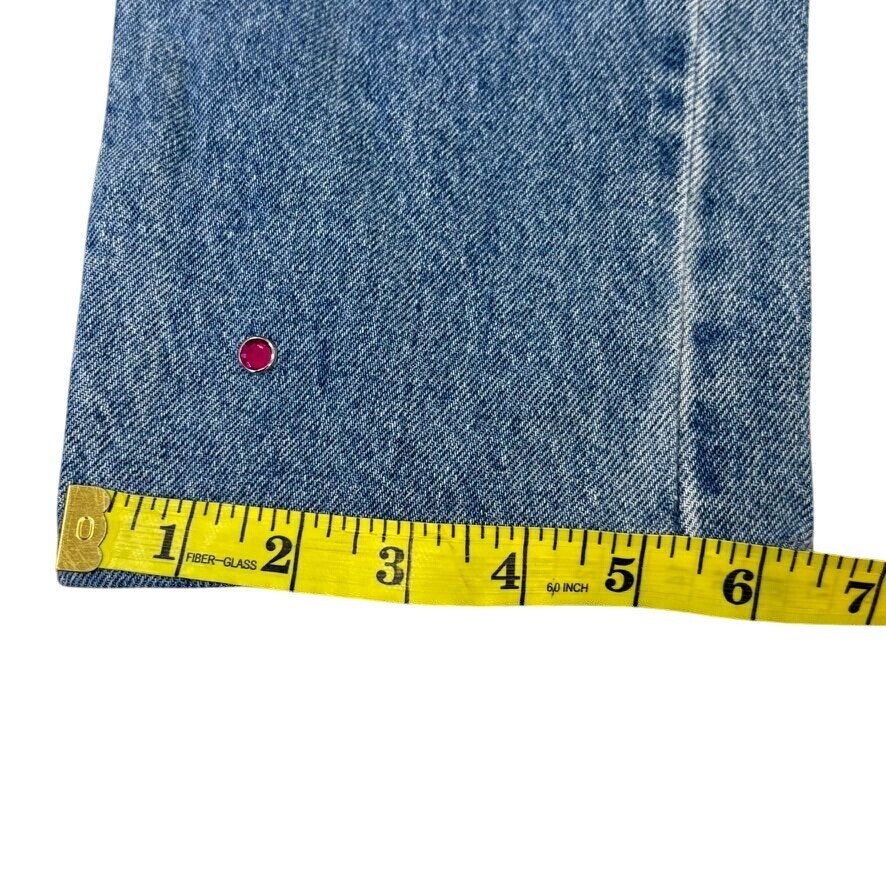Some small red rhinestones are missing, but overall jeans remain in good condition.