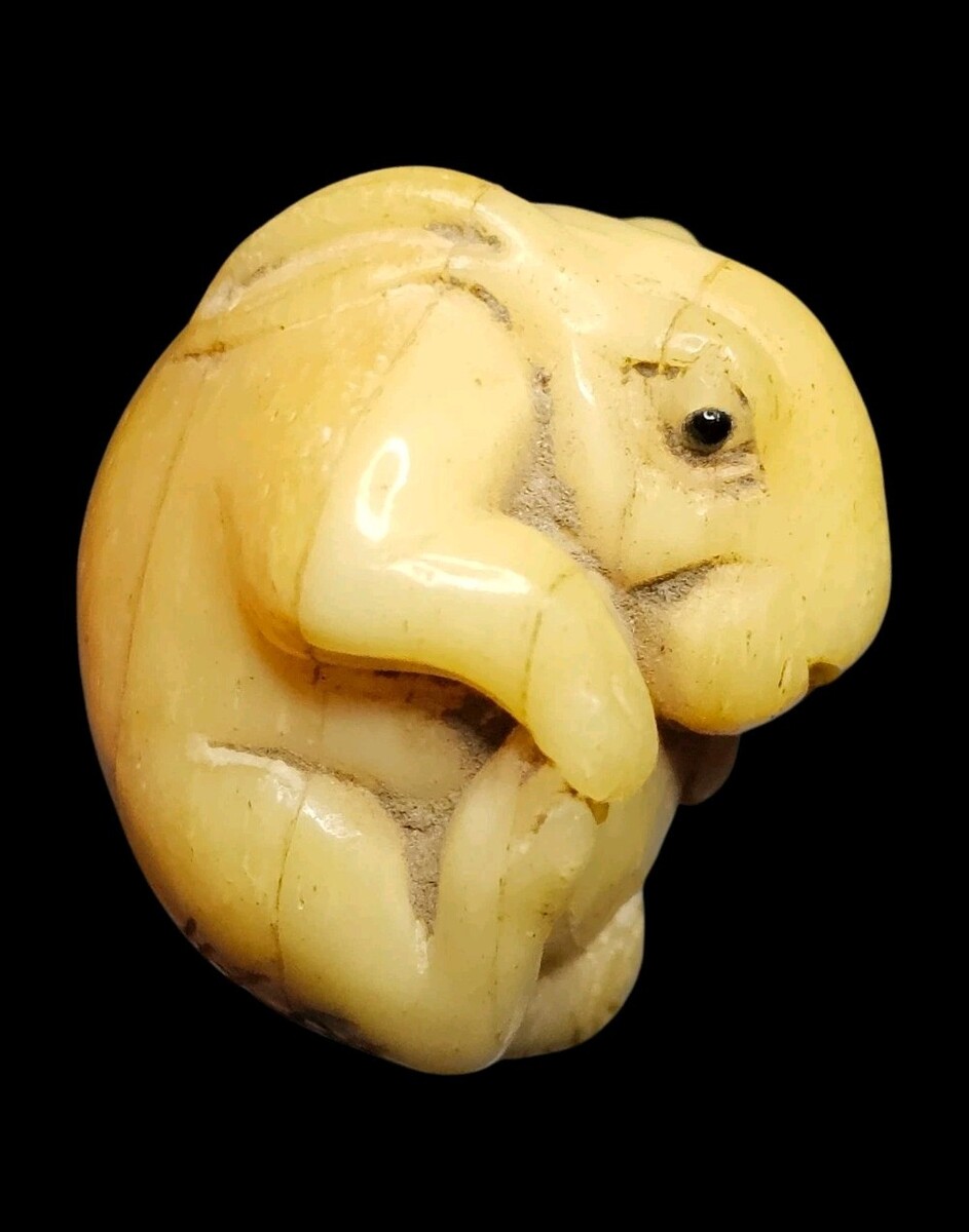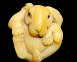 UP FOR SALE: Vintage Japanese ojime bead depicting the Zodiac Rabbit, hand-carved during the early?mid Showa era (1930s?1950s). This piece has wonderful facial expression, a curled zodiac posture, and finely carved details around the ears, paws, and tail. The bead carries a well-defined two-kanji artisan signature and displays beautiful natural patina typical of true mid-century beads.