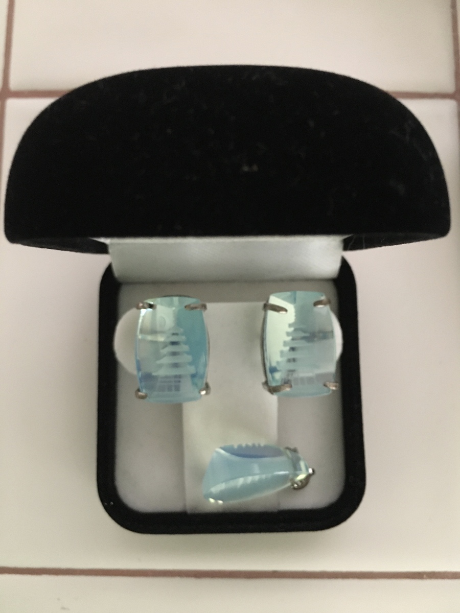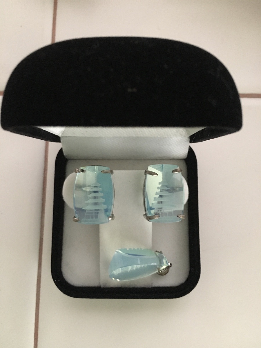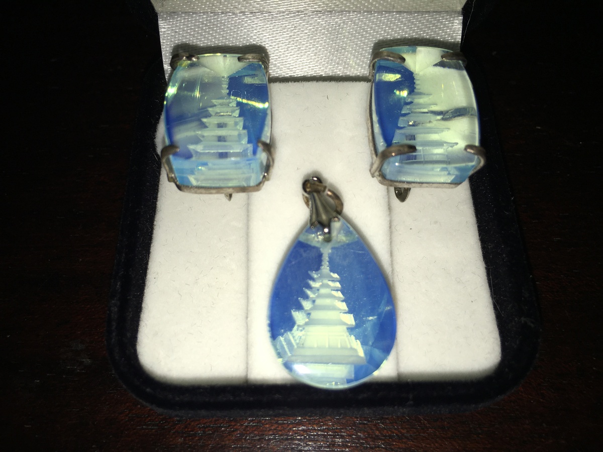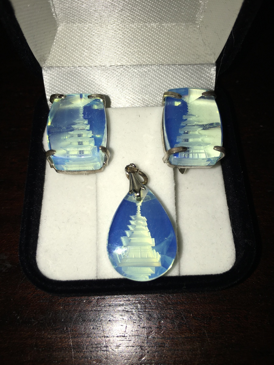 - Vintage Japanese sterling reverse carved blue glass pagoda pendant and earring s