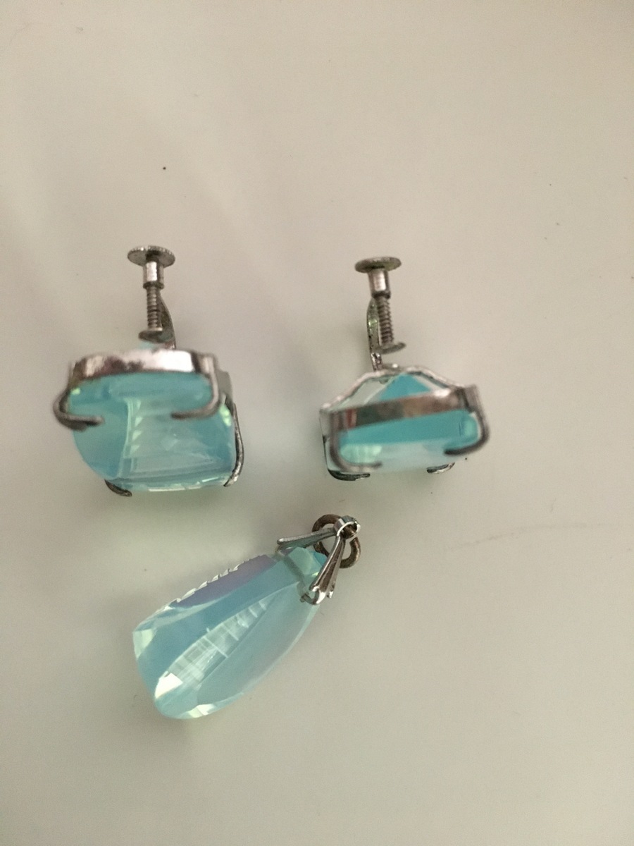 Vintage Japanese sterling reverse carved blue glass pagoda pendant and earring set