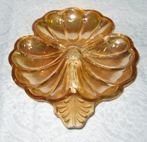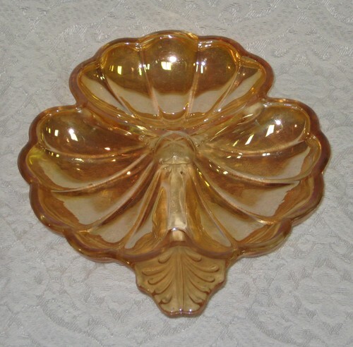 - Vintage Jeanette Amber Glass Clover Doric Pattern Candy Relish Dish Irridescent
