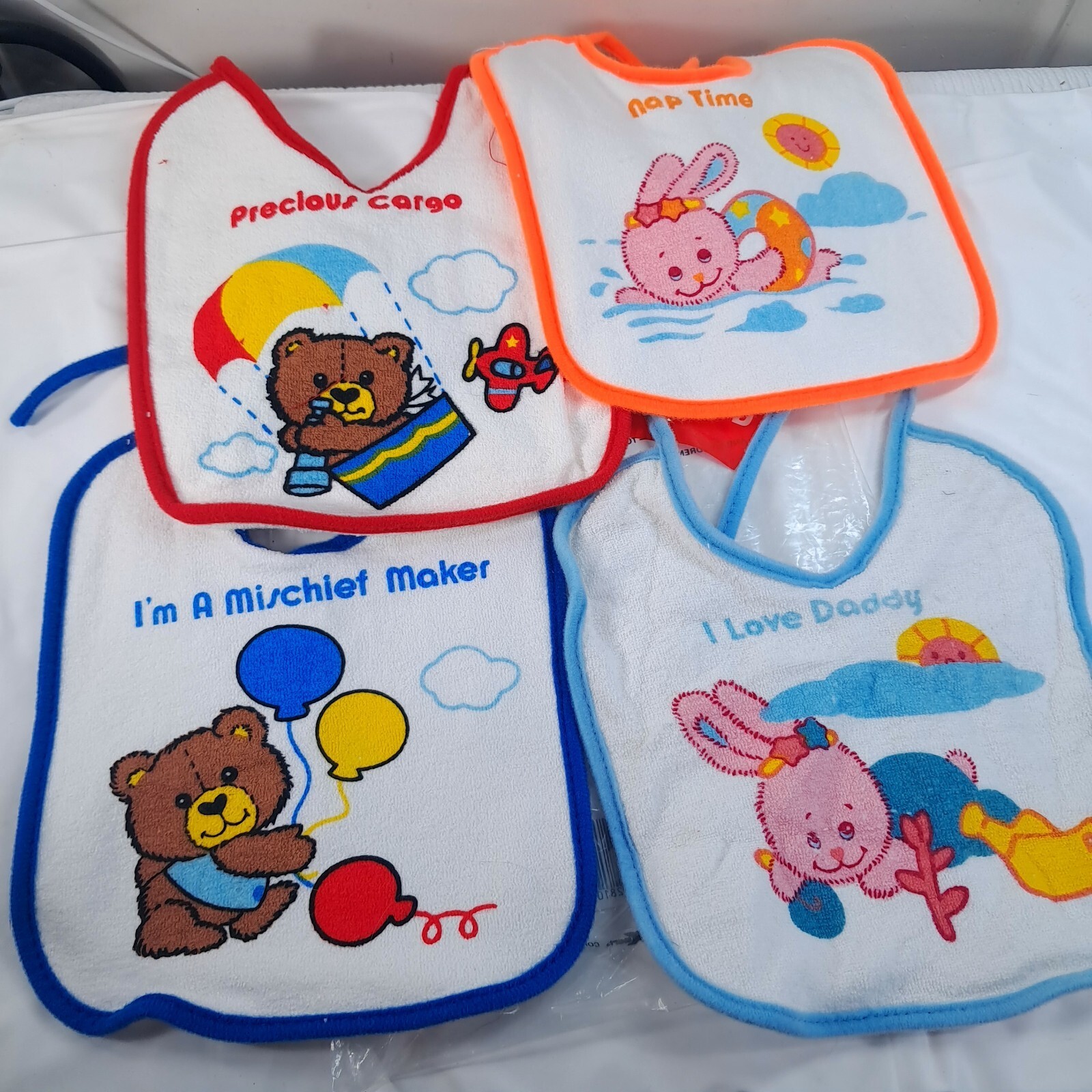 Not sure if these were ever used. Terry cloth bibs with cute graphics of bears and bunnies.