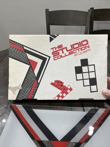 This is a vintage LE Smith serving tray from the 1980s, part of The Studio Collection. The tray is made of glass and has a retro style with a geometric pattern in red and black. It is a medium-sized rectangular tray, measuring 14 inches in width. The model name is Esprit. The tray is a collectible item and has a vintage feel to it.