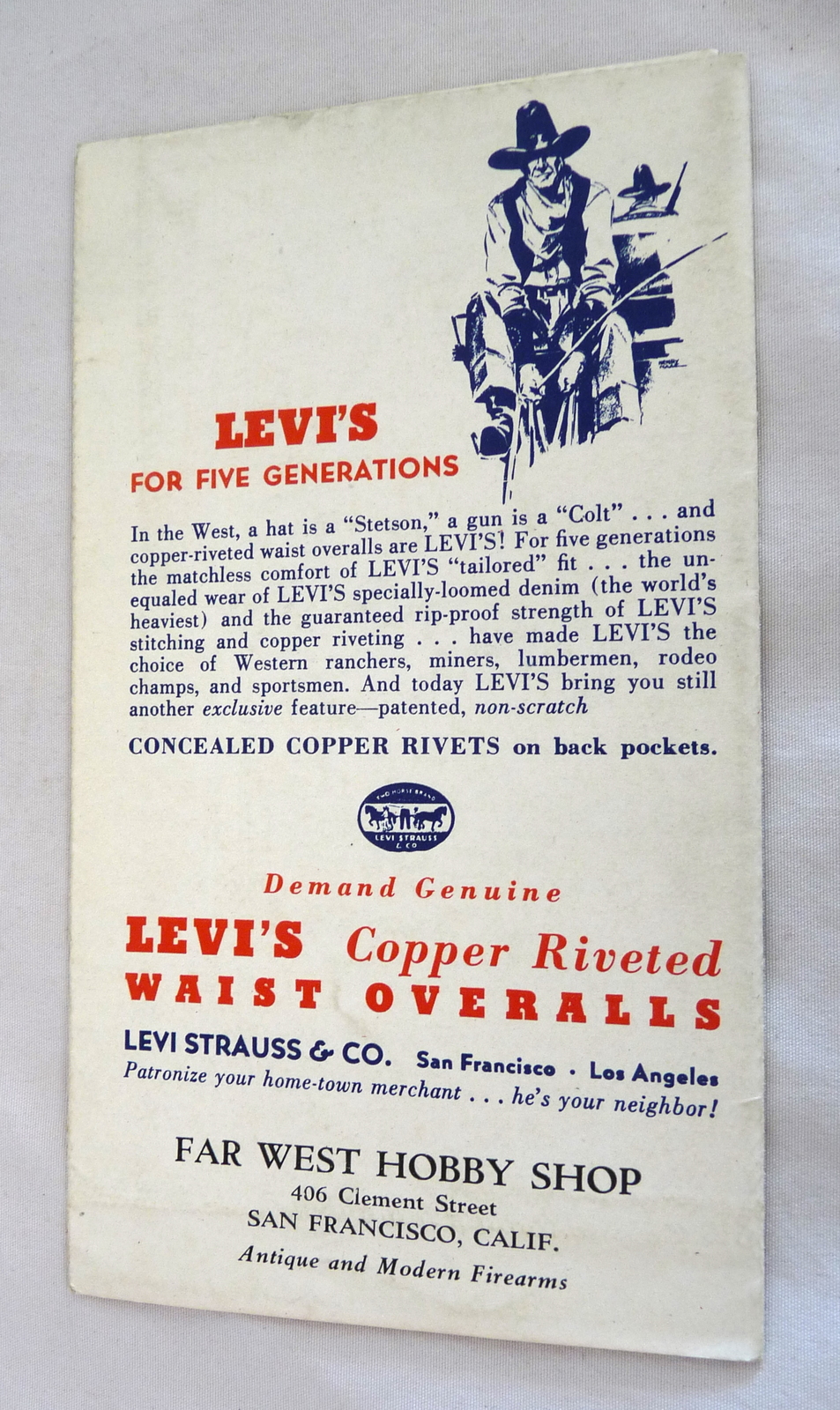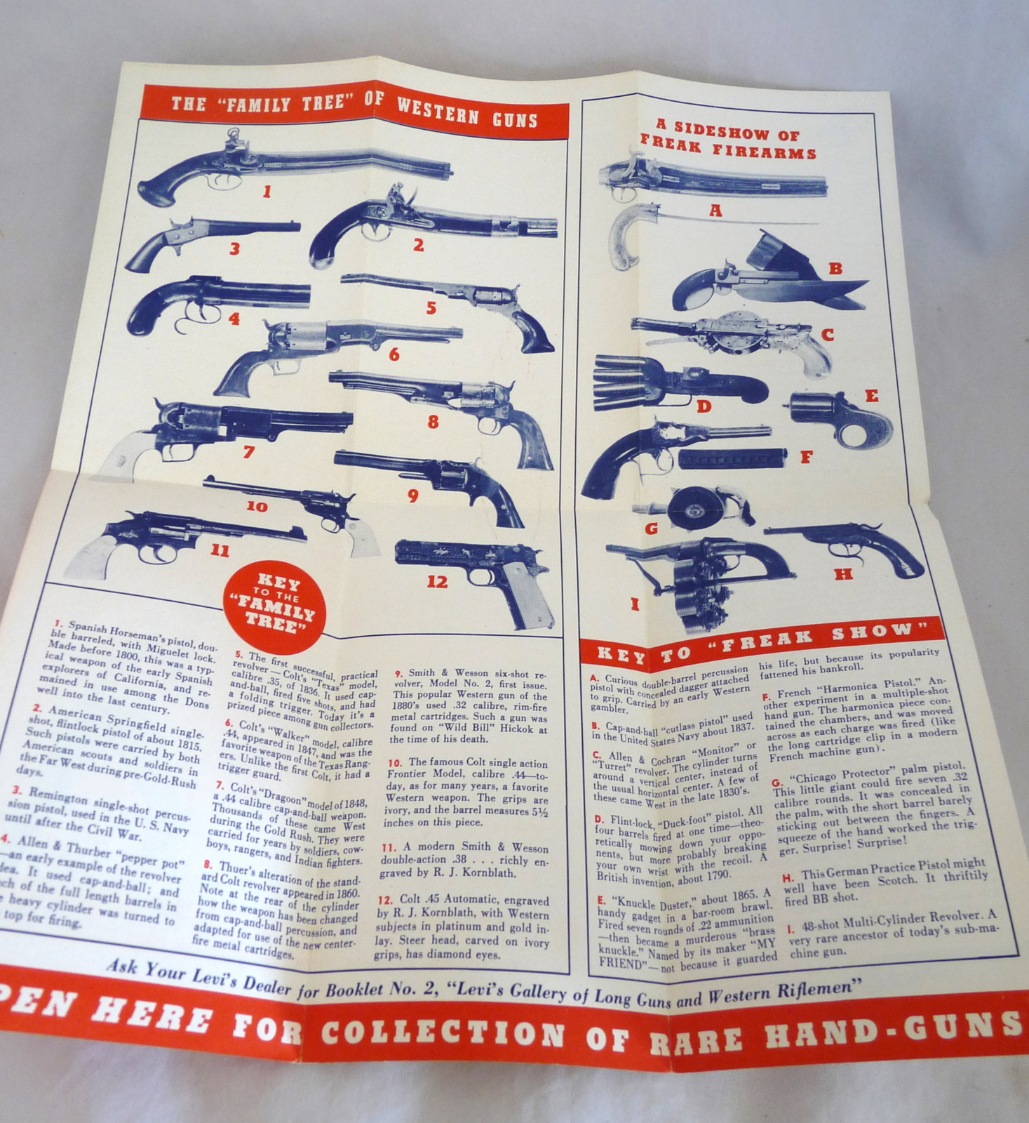 Vintage LEVI'S Gallery OF Western Guns Gunfighters advertising brochure with jeans.Far West Hobby Shop San Fran. CA. 3 3/8 X 5 7/8 6 page fold out.