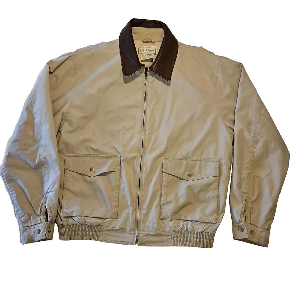 - Vintage LL Bean Chore Jacket Mens L Leather Collar Beige Canvas Quilt Lined Work