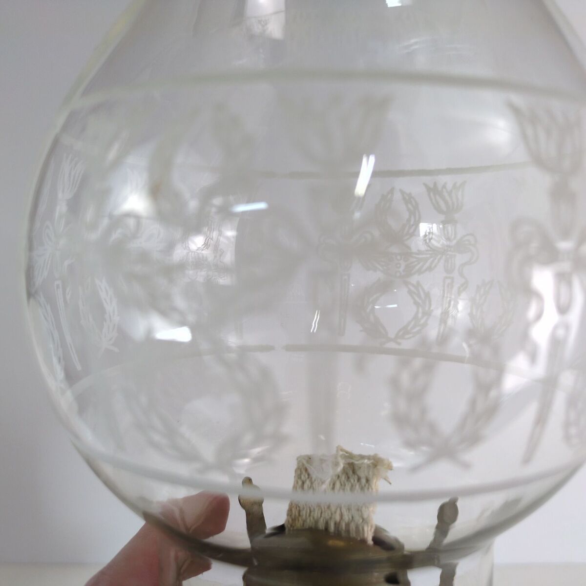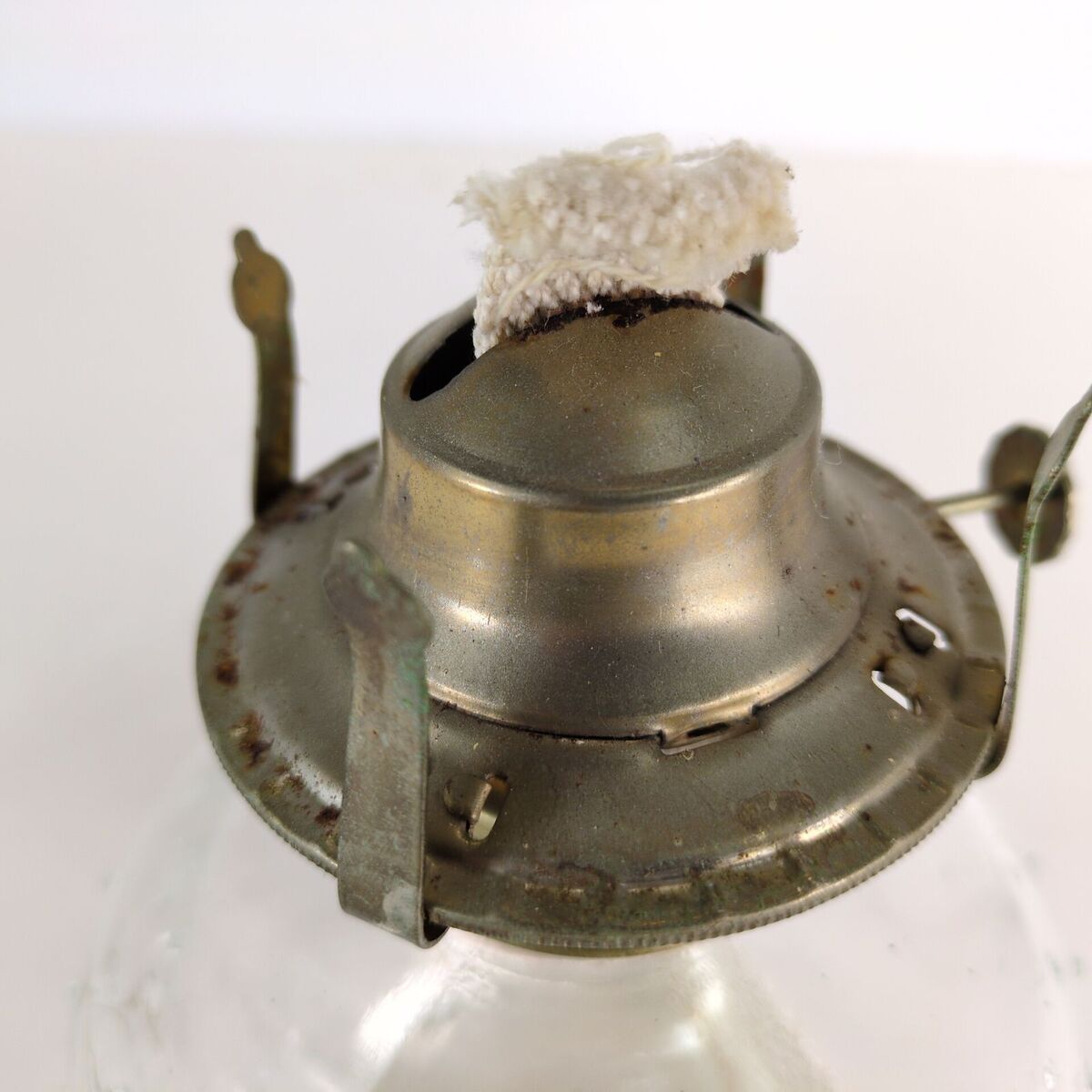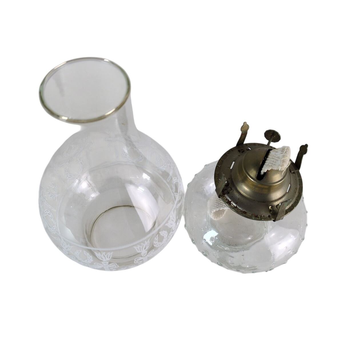 The condition is as shown in the photographs. No chips or cracks. The fiber wick and holder do not show any signs of having been used, although do have a touch of rust from storage. The bottom tank does not have any indication of having held oil - another sign that it was never used.