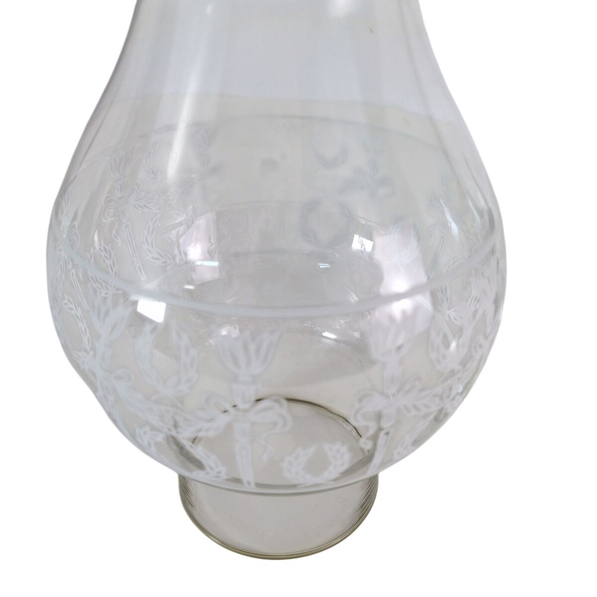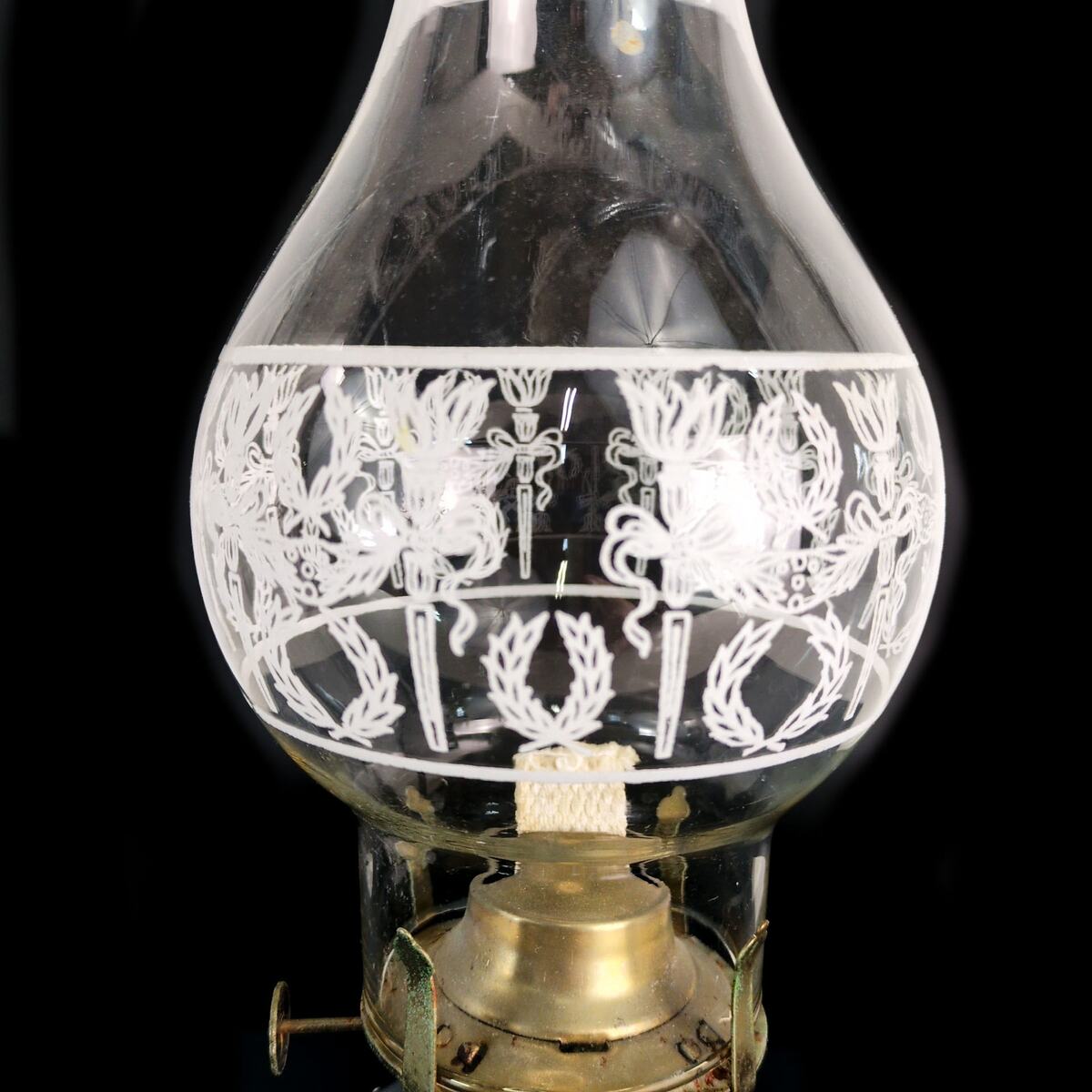 This Oil/Kerosene Lantern is by Lamplight Farms and features a clear glass hobnail base tank with a chimney style upper shade in clear glass with white Greek/Roman Revival enamel graphics. The goldtone metal components have "Lamplight Farms" on the knob. It stands 13-1/2 inches tall. Circa 1970s-80s era.