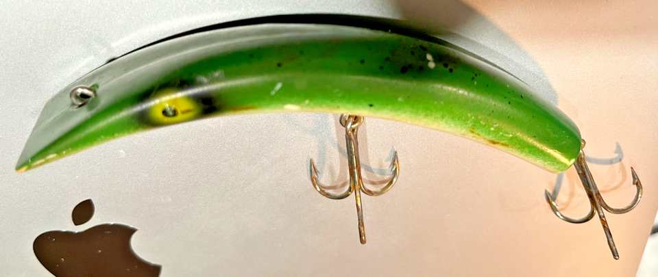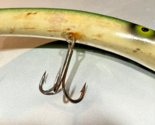 The Vintage Lazy Ike Lure in Green Bone is a classic crankbait designed for freshwater fishing. Made of durable plastic in the United States, this original piece is a vintage collectible that appeals to fishing enthusiasts and collectors. The Lazy Ike brand is known for its quality and effectiveness in attracting all freshwater fish species, making this lure a must-have for any angler looking to reel in a big catch with a touch of nostalgia.