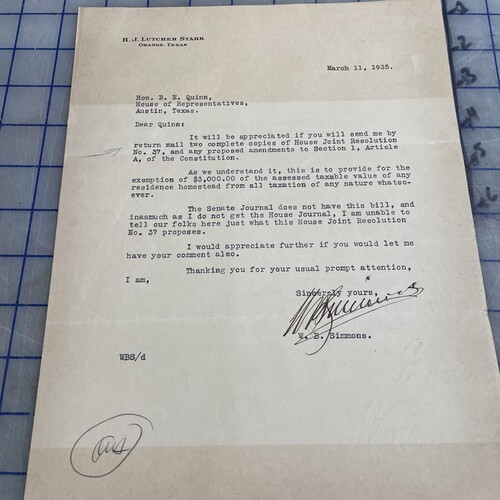 - Vintage Letter H. J. Lutcher Stark Orange Texas Signed W. B. Simmons 1935