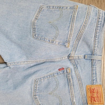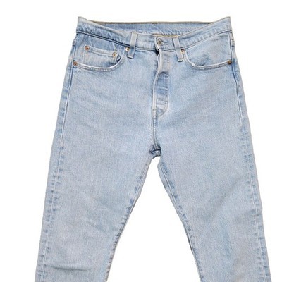 This vintage pair of Levi's 501 button fly jeans is a must-have for any stylish man's wardrobe. Made of 100% cotton, these jeans are durable and comfortable to wear. They come in a classic blue color and have a straight, skinny fit.