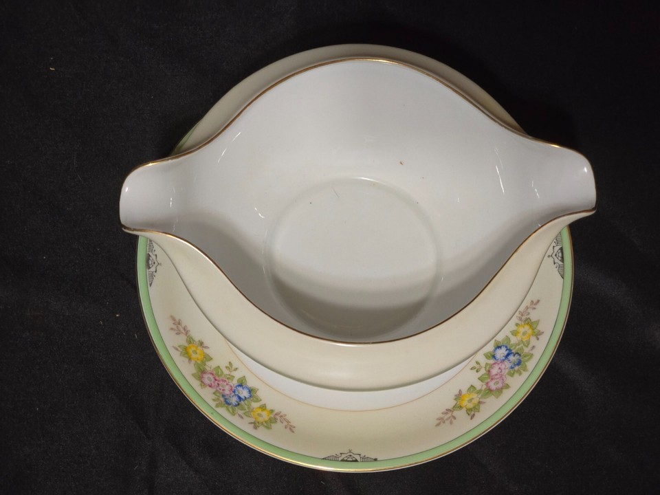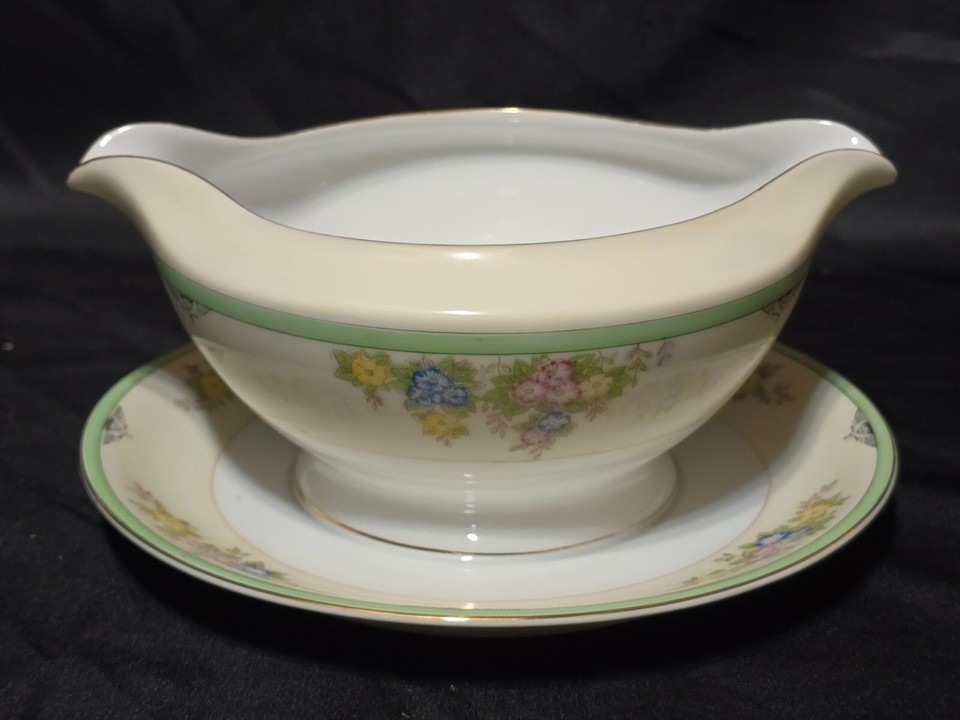 1940s Meito Isabella gravy boat with attached underplate. Item is in near