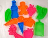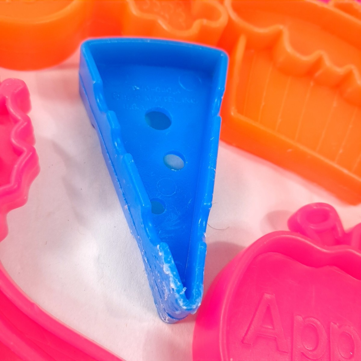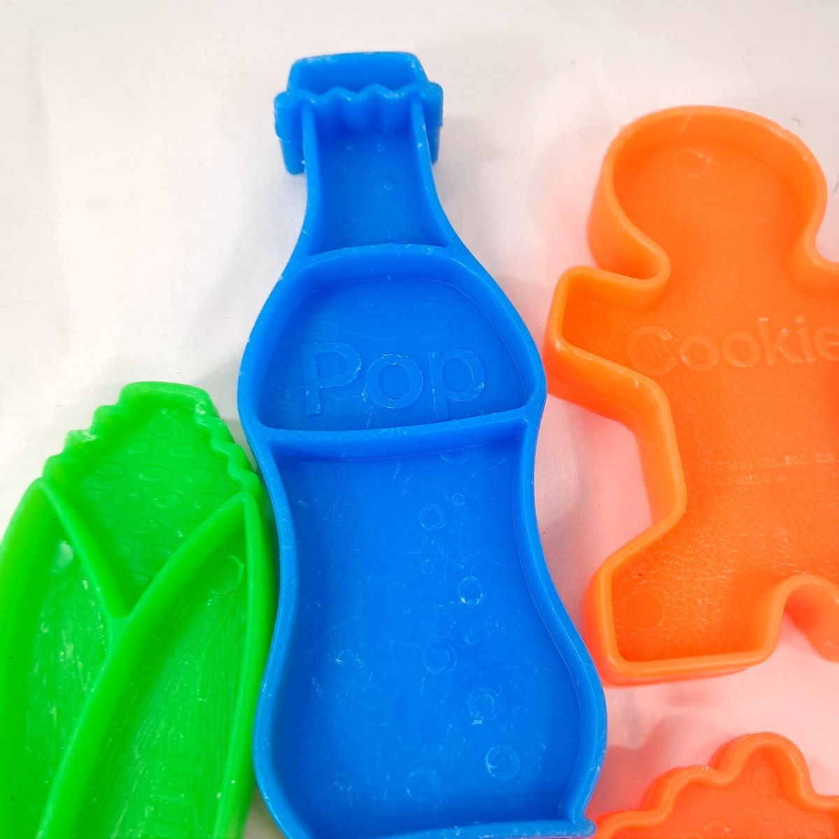 Includes steak, grapes, cupcake, cookie, apple, celery, carrot, corn, milk, cheese, and pop. Some wear/scuffs/scratches from use. See pics for details measurements.