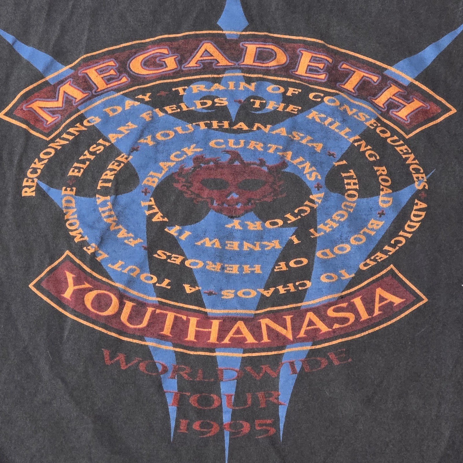 Original 1995 Megadeth Youthanasia World Tour T-shirt, featuring bold circular artwork with album and tour song titles including Reckoning Day, Train of Consequences, and A Tout Le Monde.