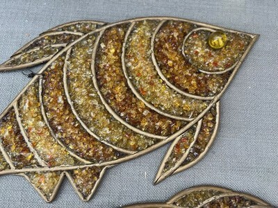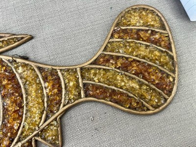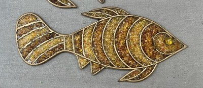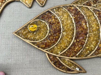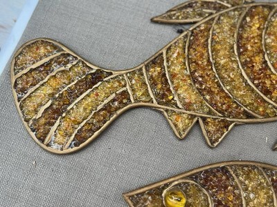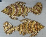 Eye-catching Mid-Century Modern fish wall decor set, featuring vibrant amber, gold, and brown crushed stone/gravel inlay within sculpted brass-toned metal outlines. Classic 1960s retro mosaic folk art style, perfect for adding texture and color to your vintage wall gallery.