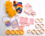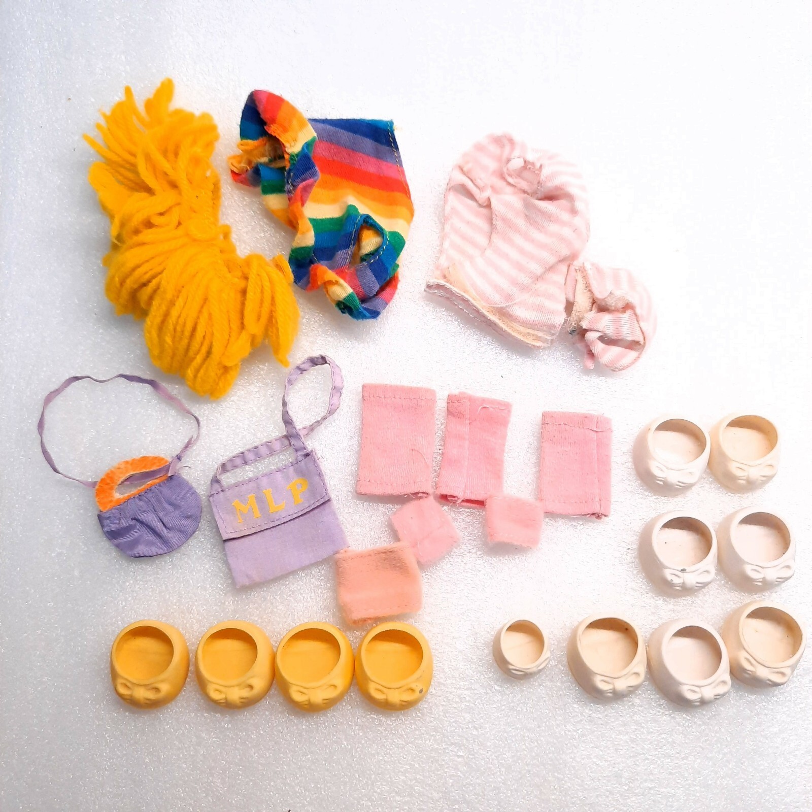 Shoes have discoloration and marks and feel a bit dry, may be good for display but not everyday play. Purple purse with orange handle has peeling/wear. Discoloration/stains to the clothing items as shown. Fair condition due to the staining. Only includes parts shown. See pics.