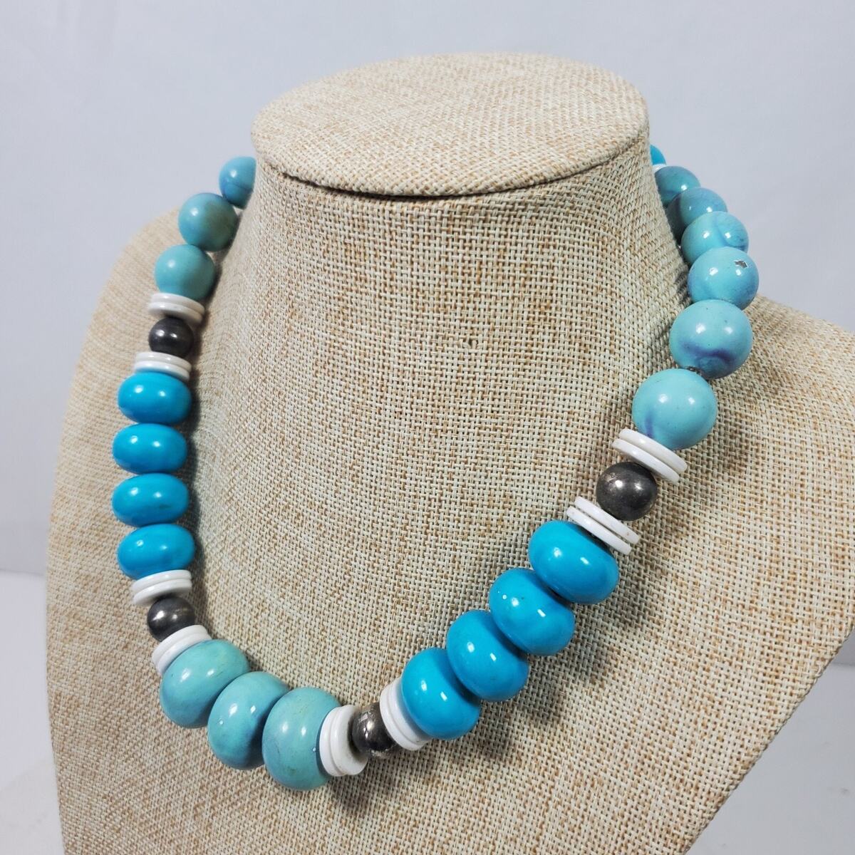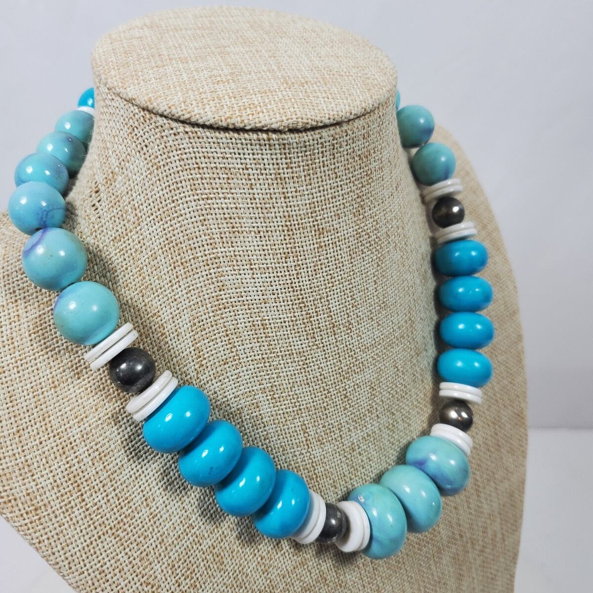- Vintage Necklace Statement 18 Inch Beaded Blue White Gold Tone
