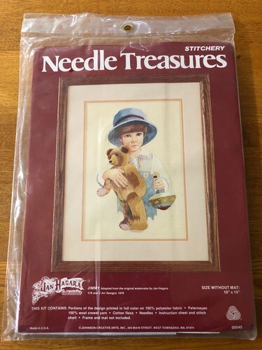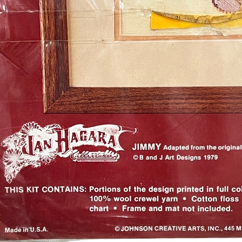 This vintage stitchery kit features a charming design by Jan Hagara, titled "Jimmy". The kit includes 100% wool crewel yarn and printed cotton fabric.