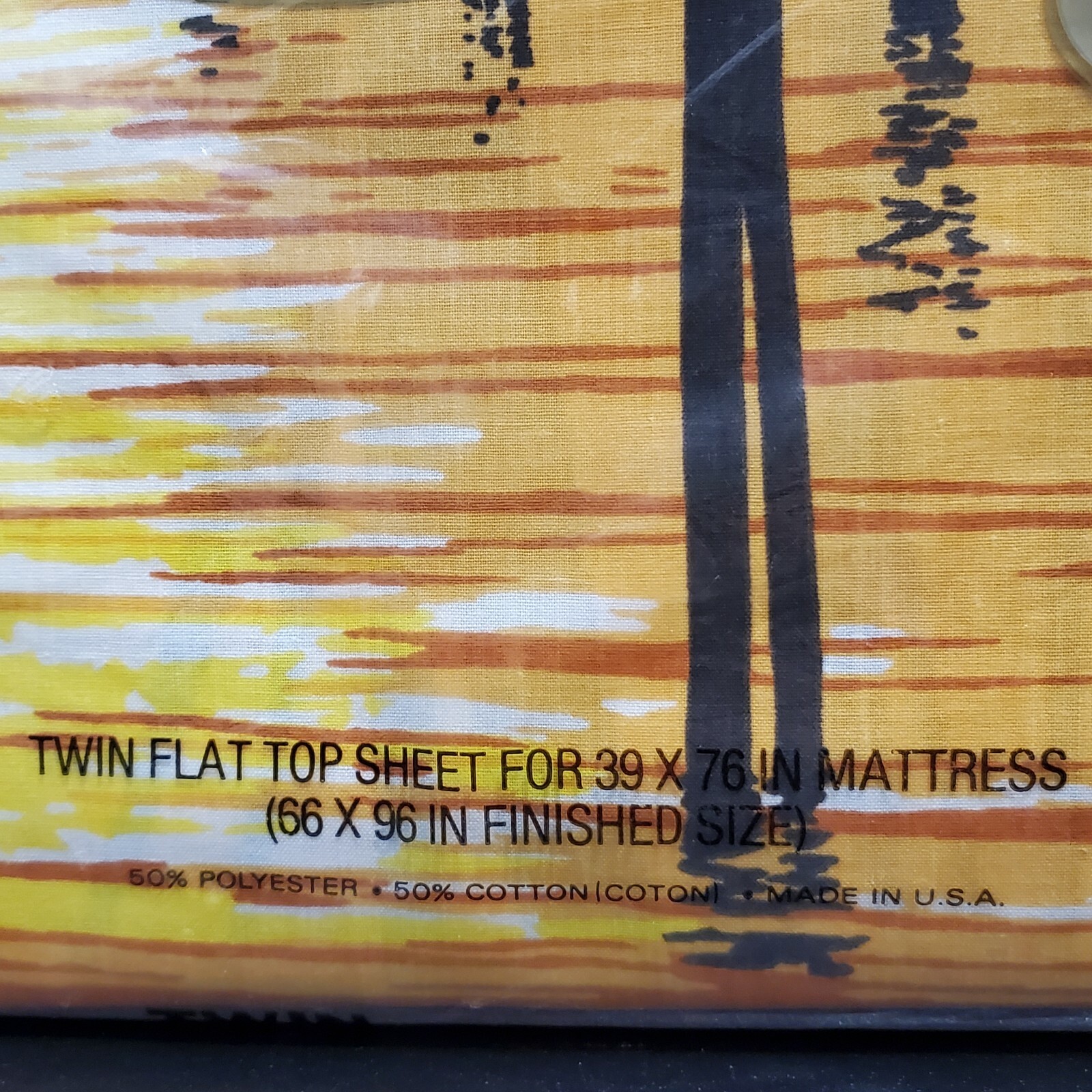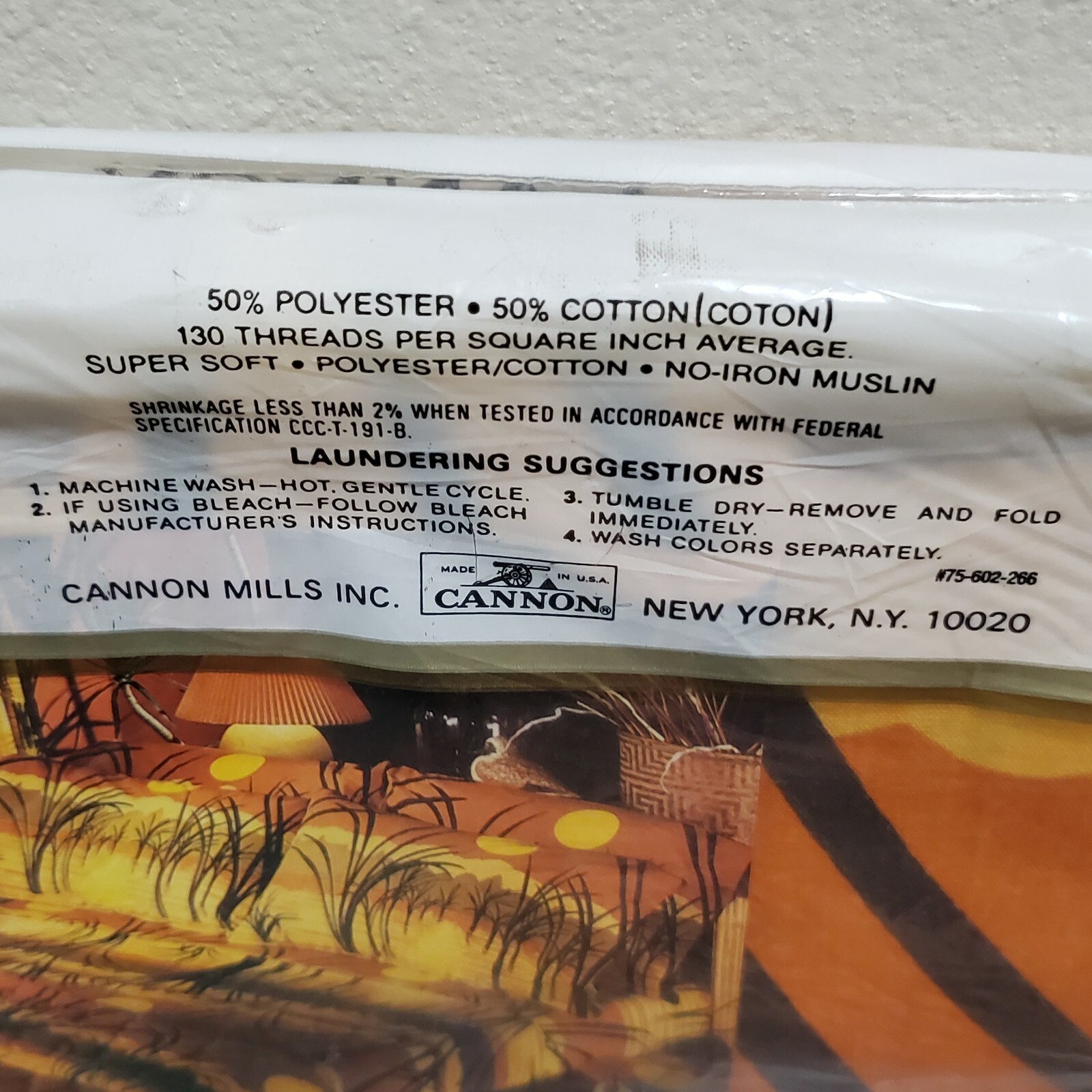 Vintage New in Package 60s / 70s Cannon Monticello Orange Sunset / Tall Reeds in Water Style (Seagrass 253) No Iron Twin Flat Sheet. 50% Cotton / 50% Polyester. Made in USA. Rare / Hard to find.