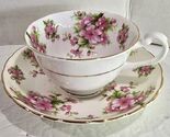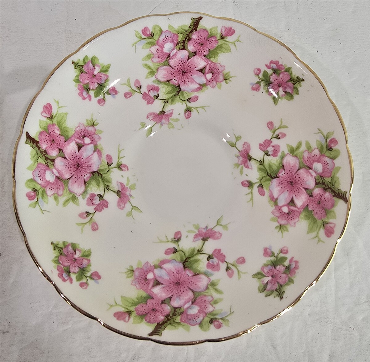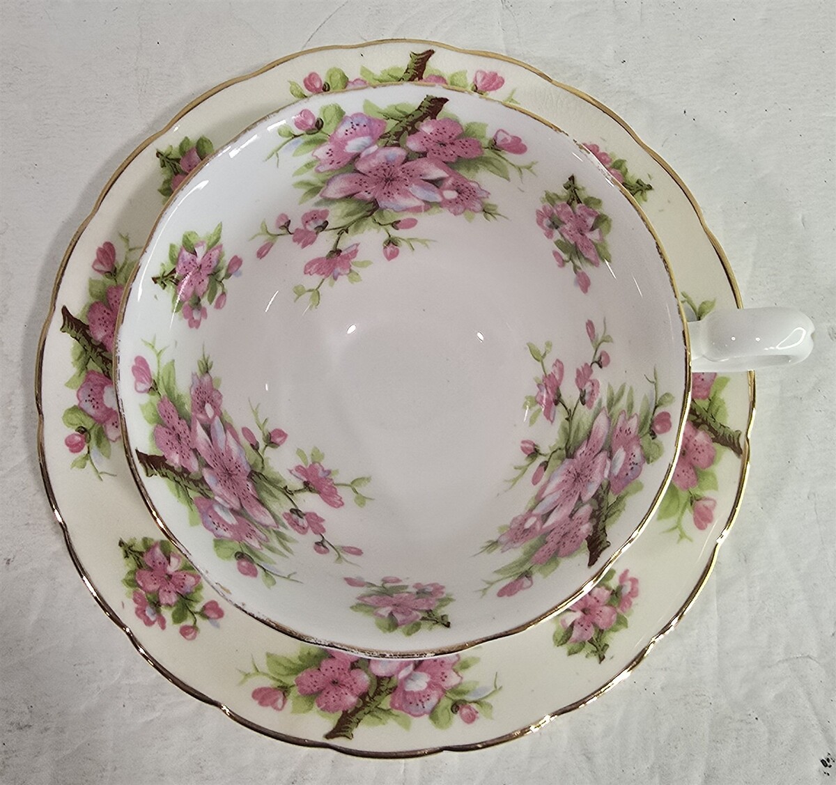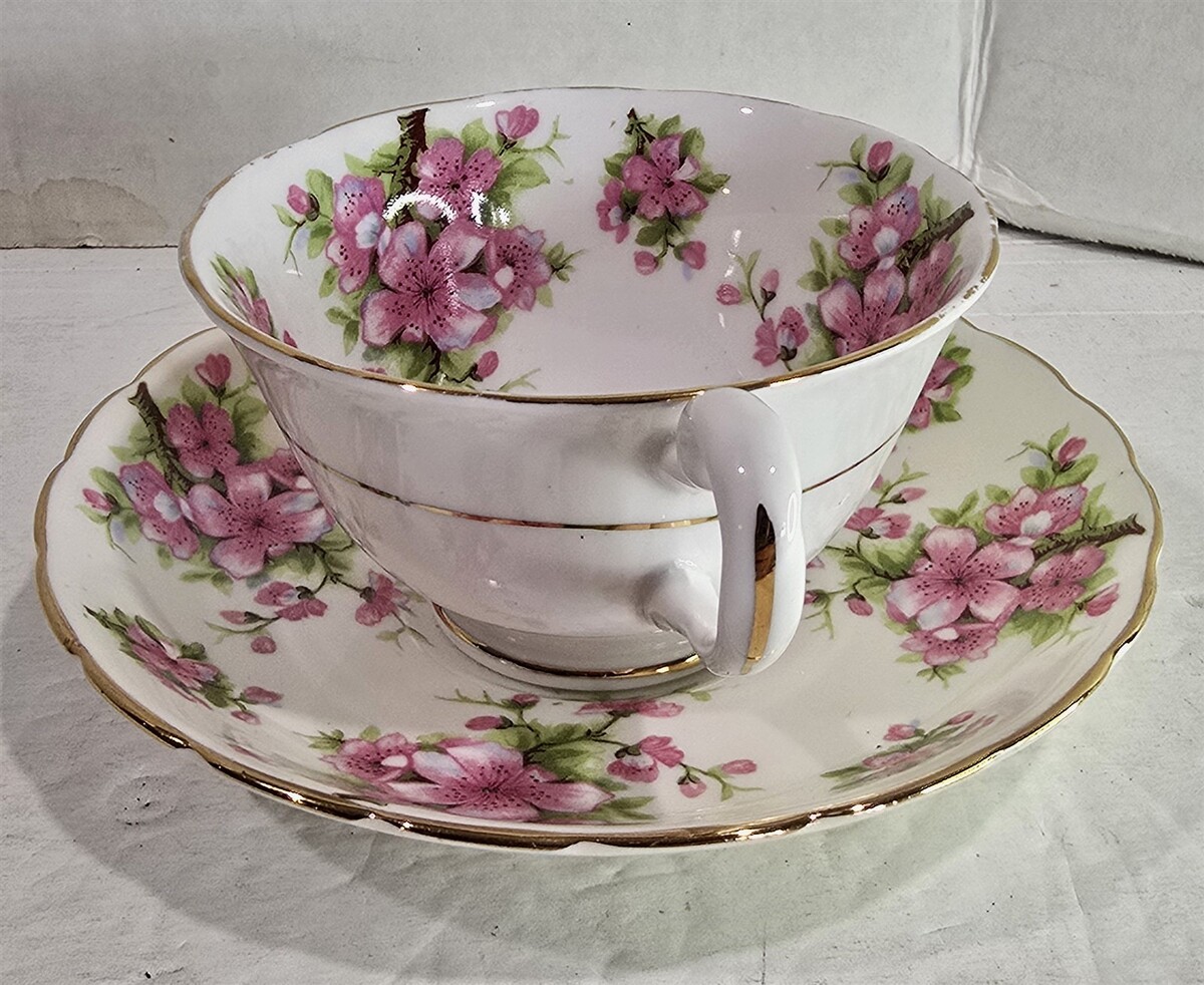 This sale is for a vintage cup and saucer, good used condition, no cracks, no chips, some crazing, some slight discoloration on underside of saucers, a few flea bites, paint wear in the gilt trim, came out of a box in the barn, saucer measures approximately 5 3/8" diameter and cup 4 5/8" wide x 3 5/8" diameter x 2 1/8" high, from a smoke free home.