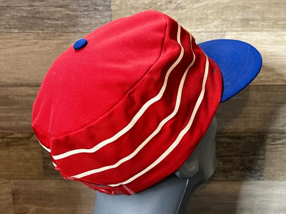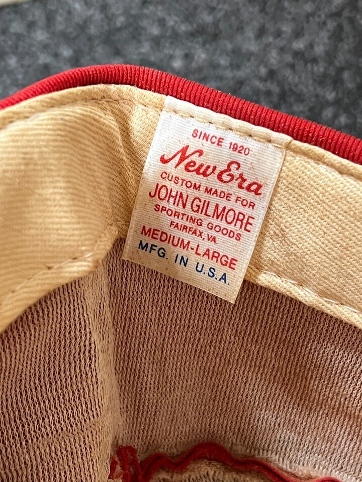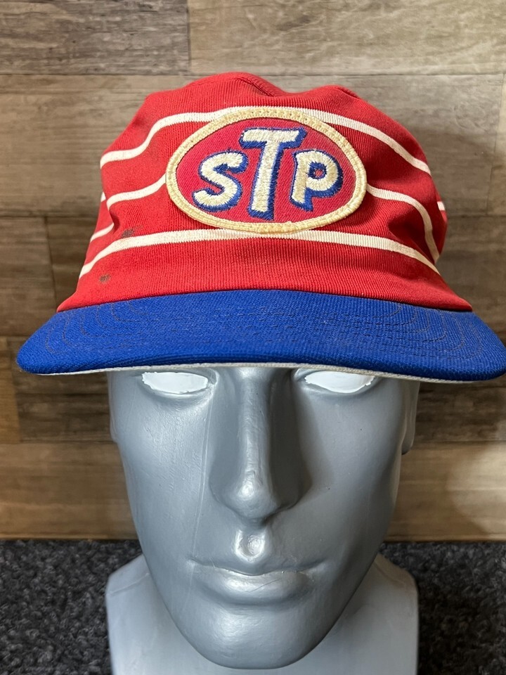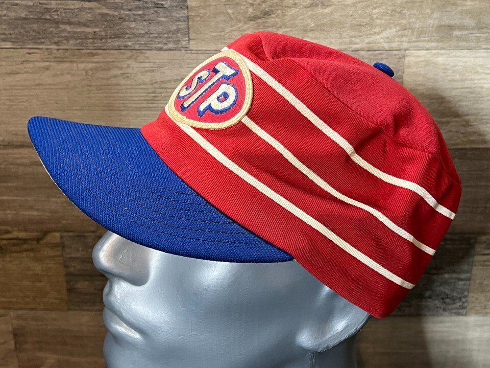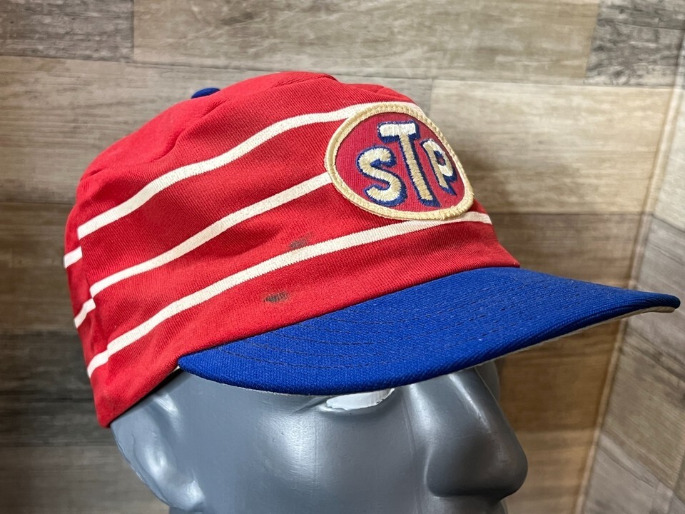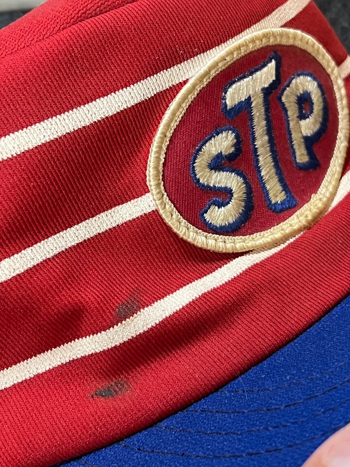 The item for sale is a vintage New Era Custom STP Racing Snapback Pillbox Hat Red w/ White Stripes. Custom made for John Gilmore Sporting Goods in Virginia. It's a bit dirty, and the foam layer inside the hat is disintegrating and coming out in powder form.
