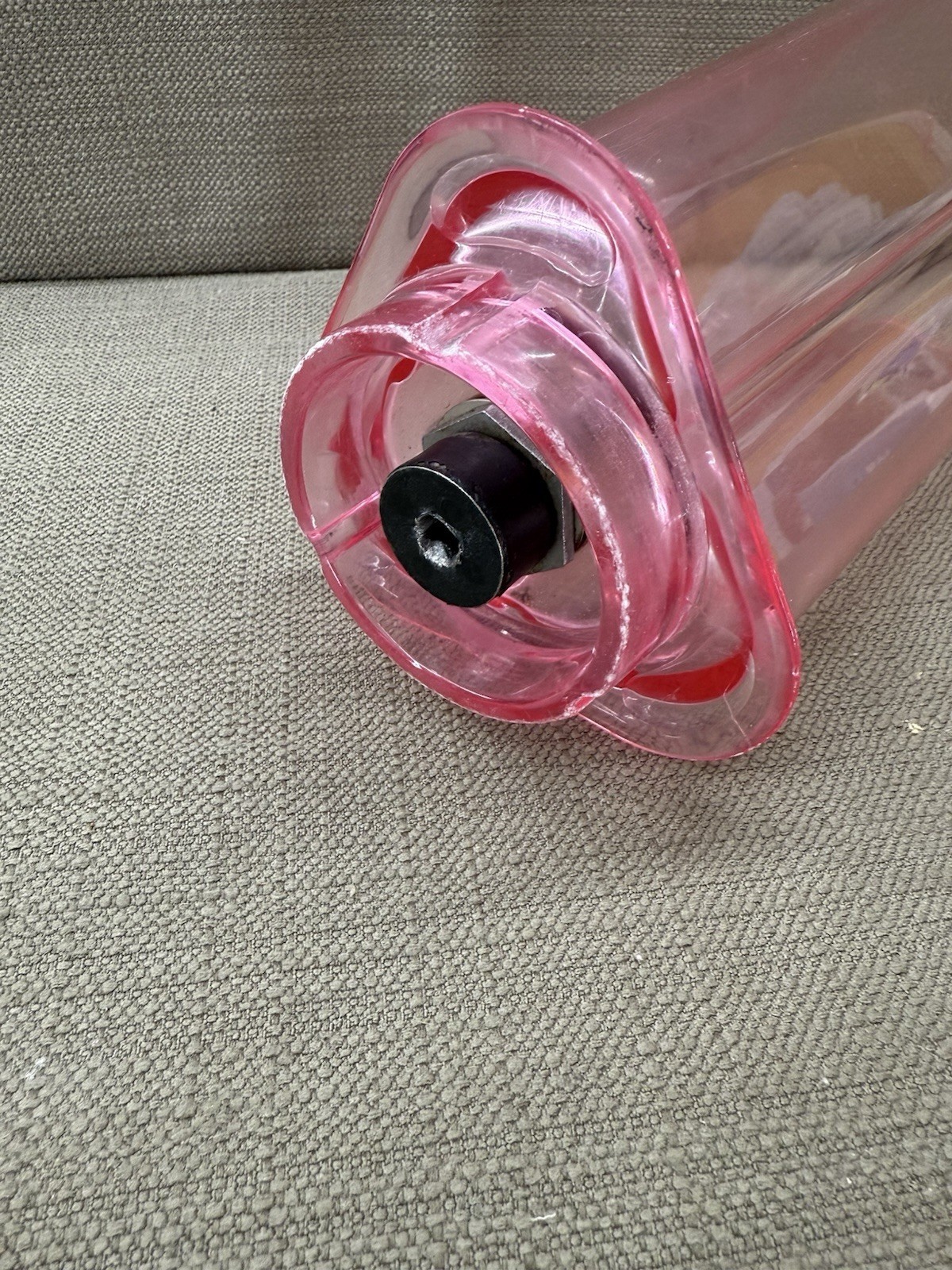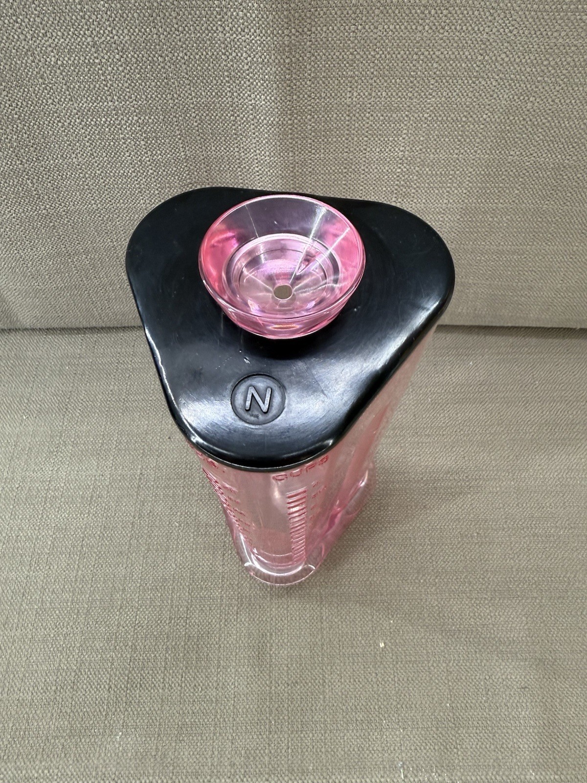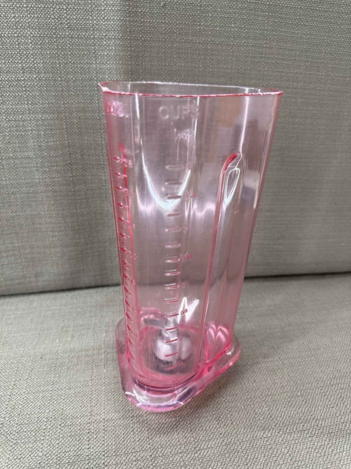 Vintage NuTone pink blender jar with lid for the built-in Food Center system, a true mid-century modern kitchen collectible. Features the original blush pink translucent plastic body, clear measurement markings, and matching lid with removable cap. There is wear on the lip of the jar.
