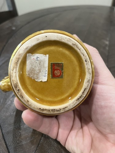 This is a vintage ceramic coffee mug from Brinns featuring an owl design with 3-D flowers on a tree stump. The mug is brown in color and has a unique pattern. It is made of ceramic and porcelain materials.