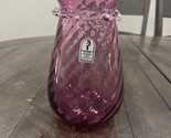 - Vintage Pilgrim Glass Small Vase Optic Swirl Cranberry Ruffled Top Sticker 7”
