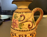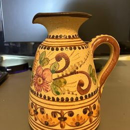This vintage clay pitcher from Lisbon, Portugal is beautifully painted (hand-painted, I believe) with a wonderful floral motif. The pitcher stands 7" tall and is 4 1/4" in diameter at base.