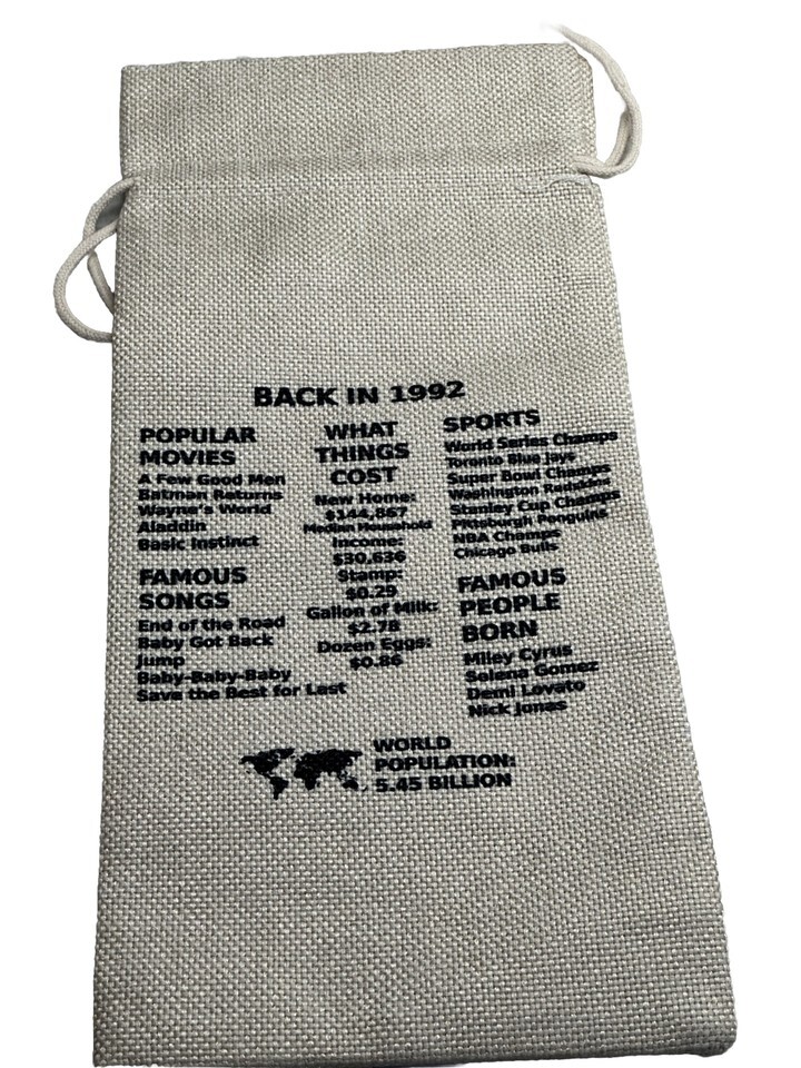 This bag is perfect for any wine lover who appreciates a touch of vintage charm. It can hold one bottle of wine and is ideal for transporting your favorite wine to dinner parties, picnics, or any special occasion. The 1992 aged perfection wine bottle bag is a must-have for any wine connoisseur. ShipN24Hours. Inventory Location MW753