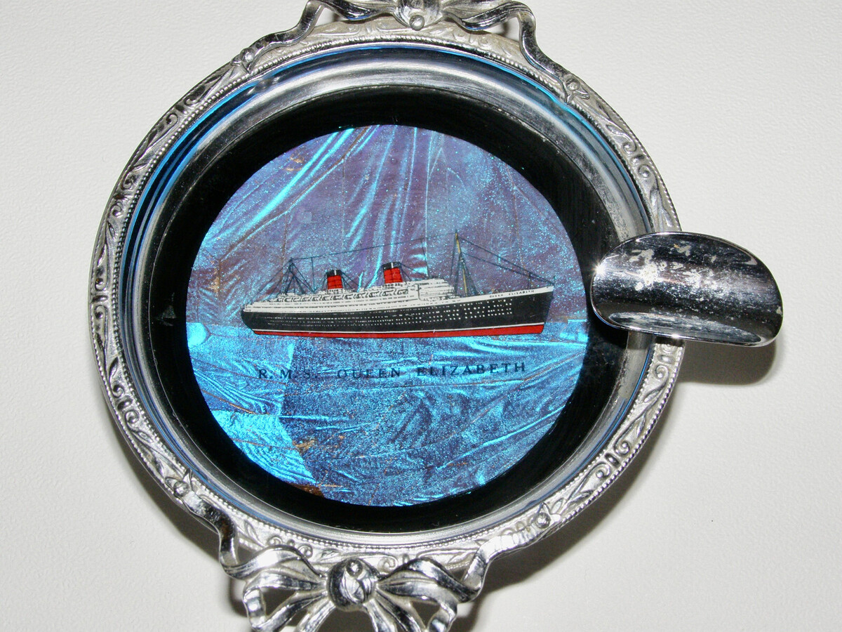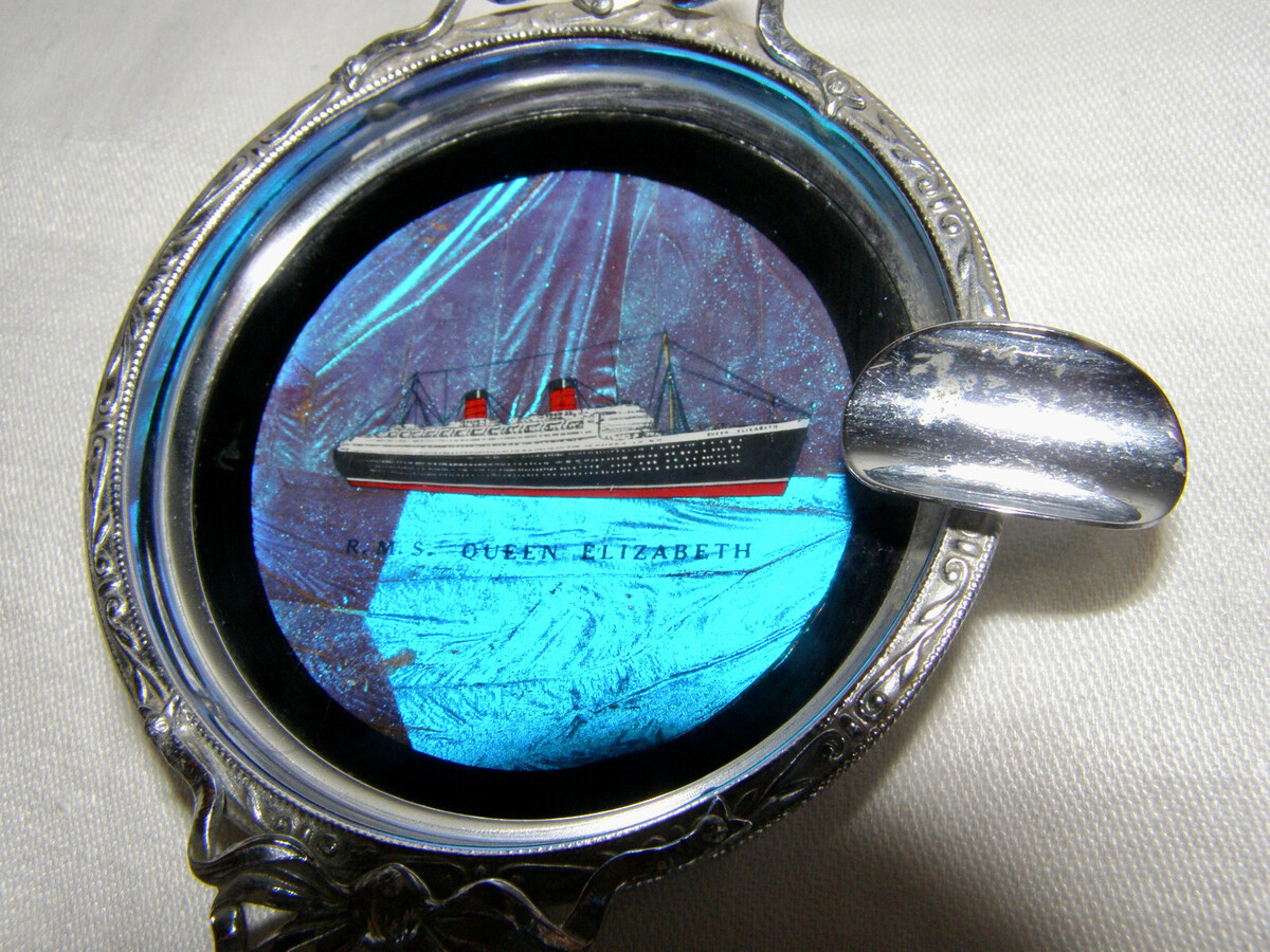 ASHTRAY, DEPICTING THE FINELY DETAILED R.M.S. QUEEN ELIZABETH ON BUTTERFLY WING BACKGROUND IS