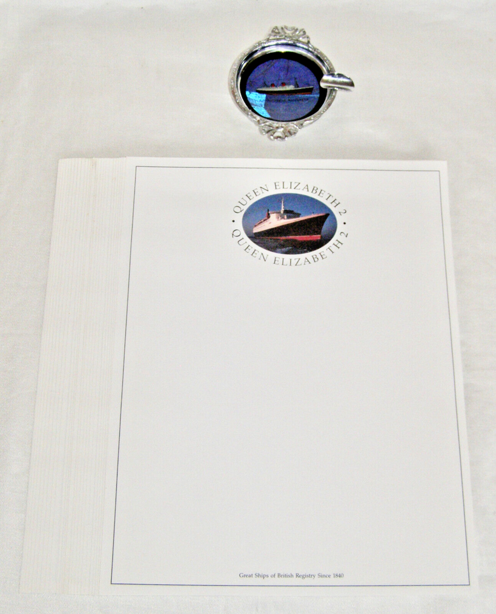 VINTAGE “R.M.S. QUEEN ELIZABETH 2” IRIDESCENT BUTTERFLY WING ASHTRAY+ STATIONARY
