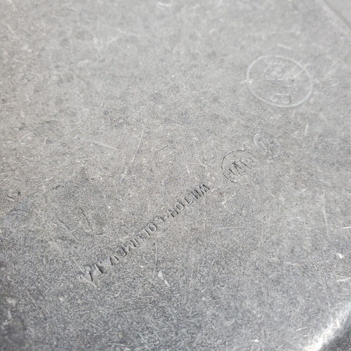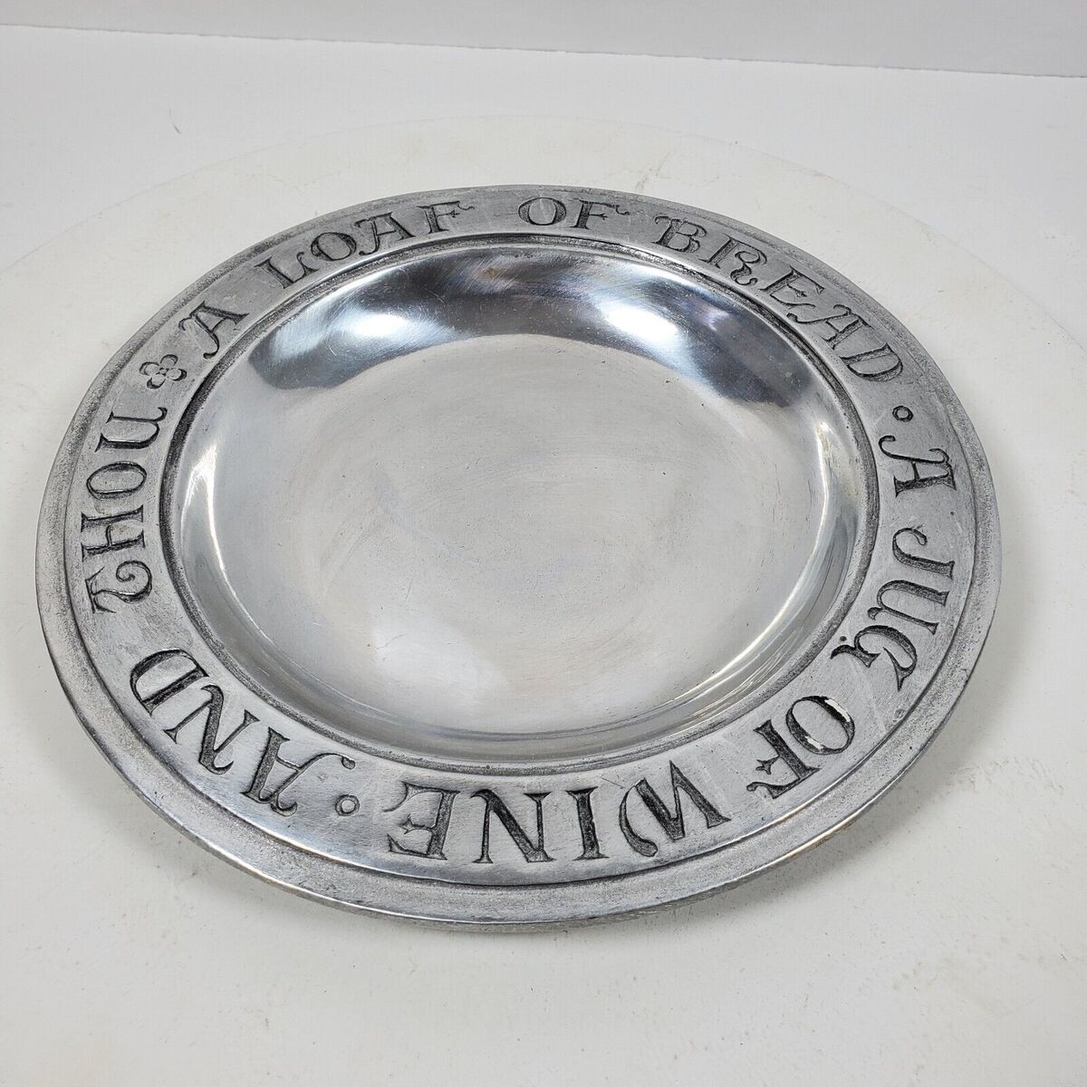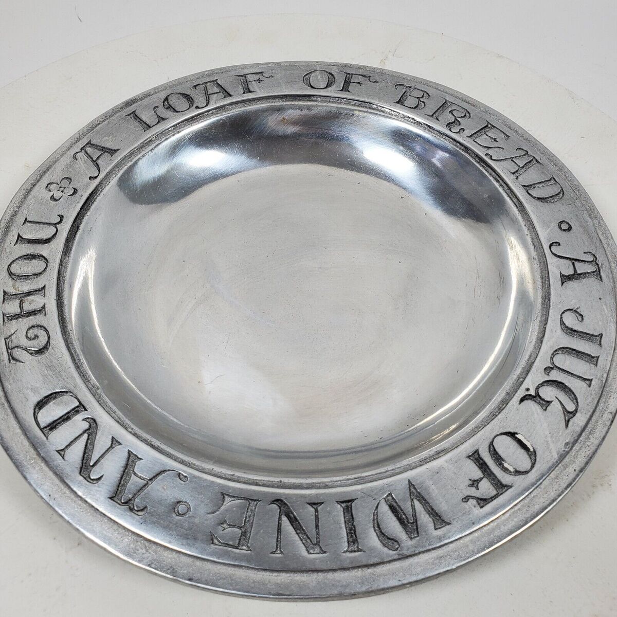This vintage RWP Wilton Columbia bowl is a unique addition to any collection. Made of pewter in the United States, it features a charming design of a loaf of bread and a jug of wine. The bowl measures 9.5 inches and is perfect for display or everyday use. The brand, Wilton, is known for its quality metalware and this antique piece is no exception. Whether you're a collector or simply looking for a one-of-a-kind piece, this bowl is sure to impress.