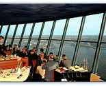 This vintage lithograph postcard captures a stunning panoramic view from the iconic tower restaurant of the Radisson Blu Royal Hotel in Copenhagen, Denmark. The image showcases diners enjoying an elegant meal while overlooking the harbor and cityscape, reflecting mid-20th century style and architecture. The expansive slanted windows provide a breathtaking vista of the waterfront, ships, and urban landscape beyond, highlighting Denmark's maritime heritage.