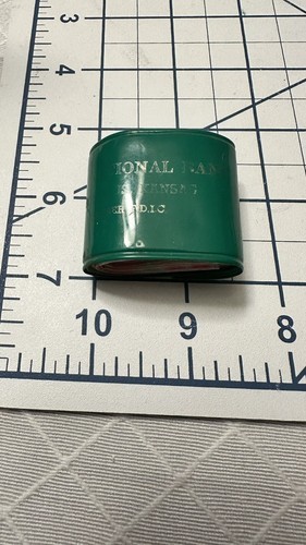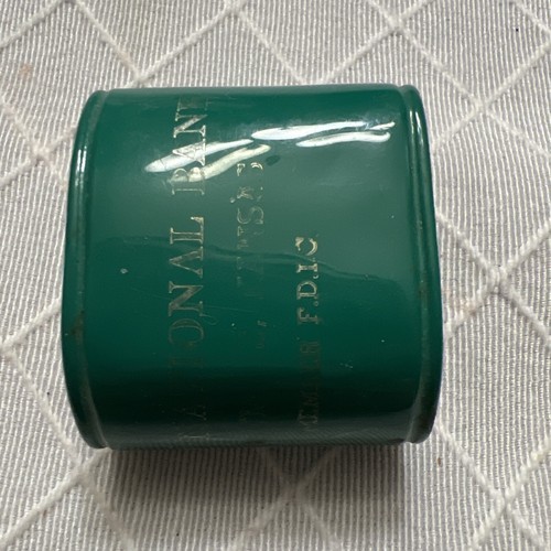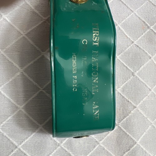 The vintage rain bonnet is a promotional item from 1st National Bank, featuring a green color scheme. This original advertisement piece served as a practical and useful item for customers, showcasing the bank's branding in a unique way. The rain bonnet likely dates back to a specific time period and holds value as a collectible advertising piece for those interested in vintage bank memorabilia.