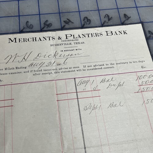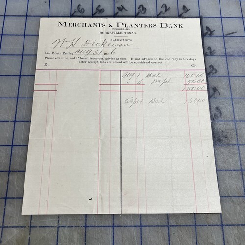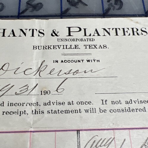 - Vintage Receipt Merchants & Planters Bank Burkeville Texas Newton County 1906