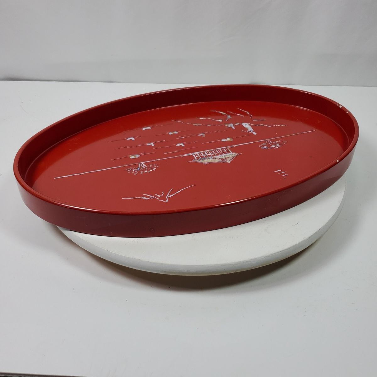 - Vintage Red Oval Wood & Mother of Pearl Serving Tray 18 Inch Long