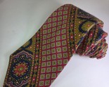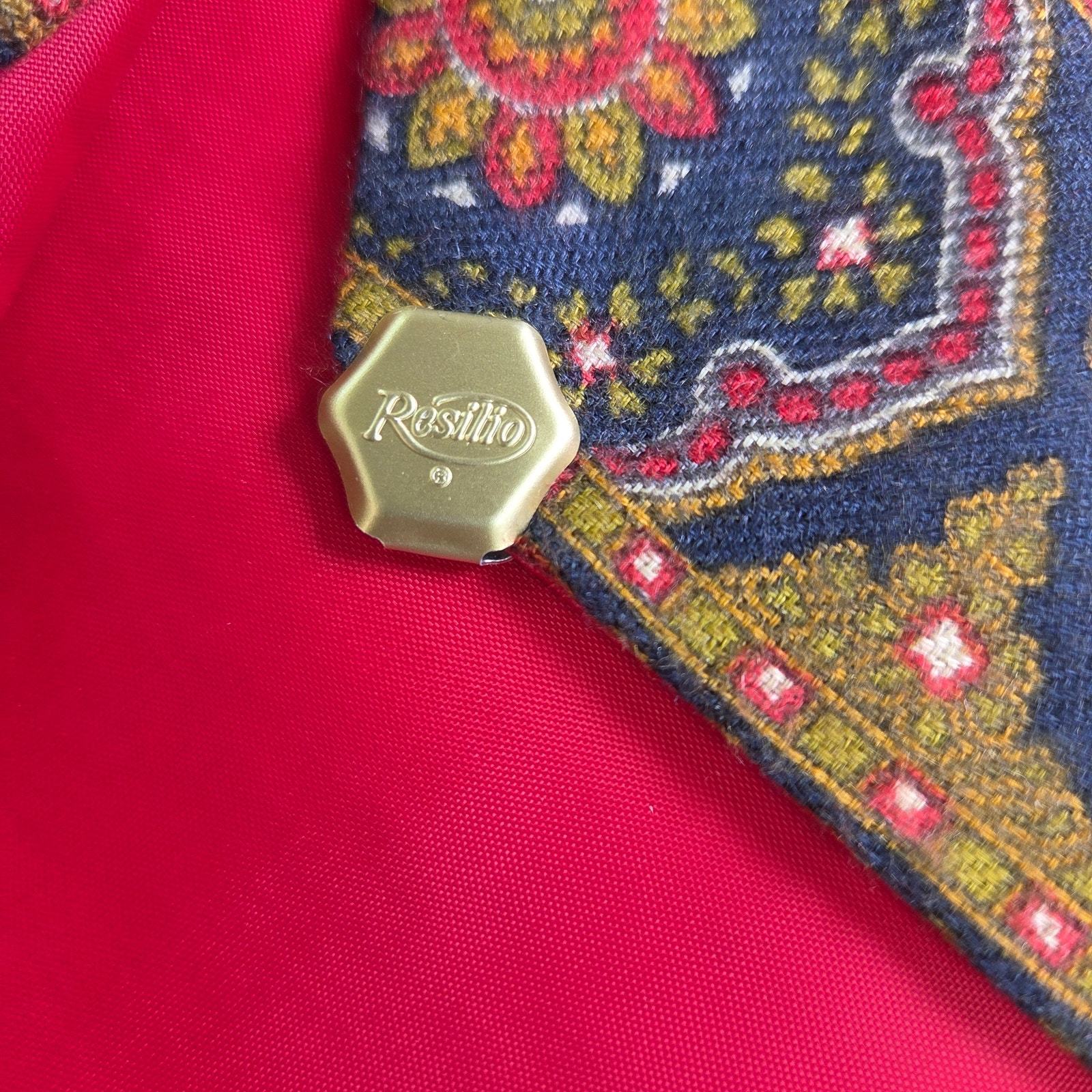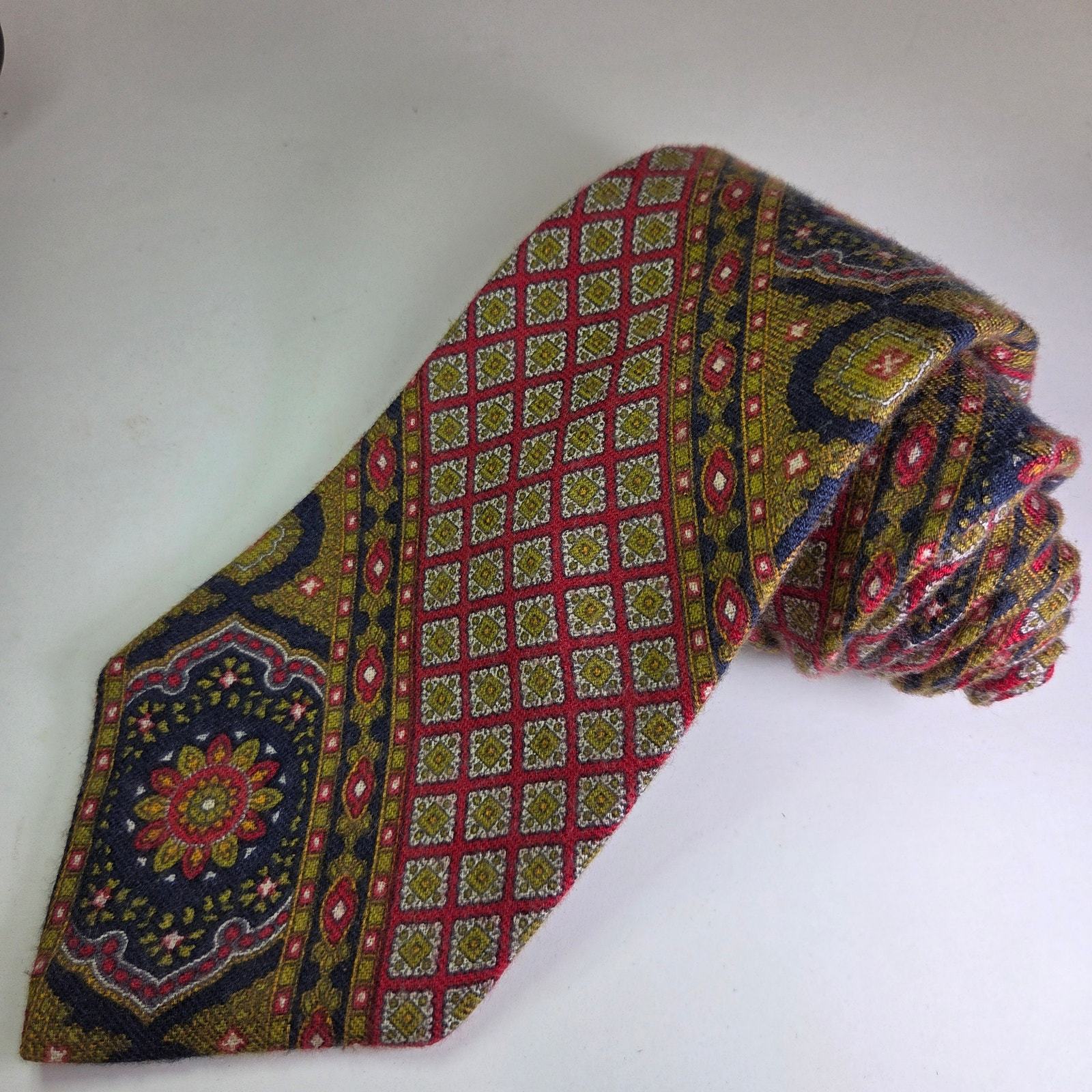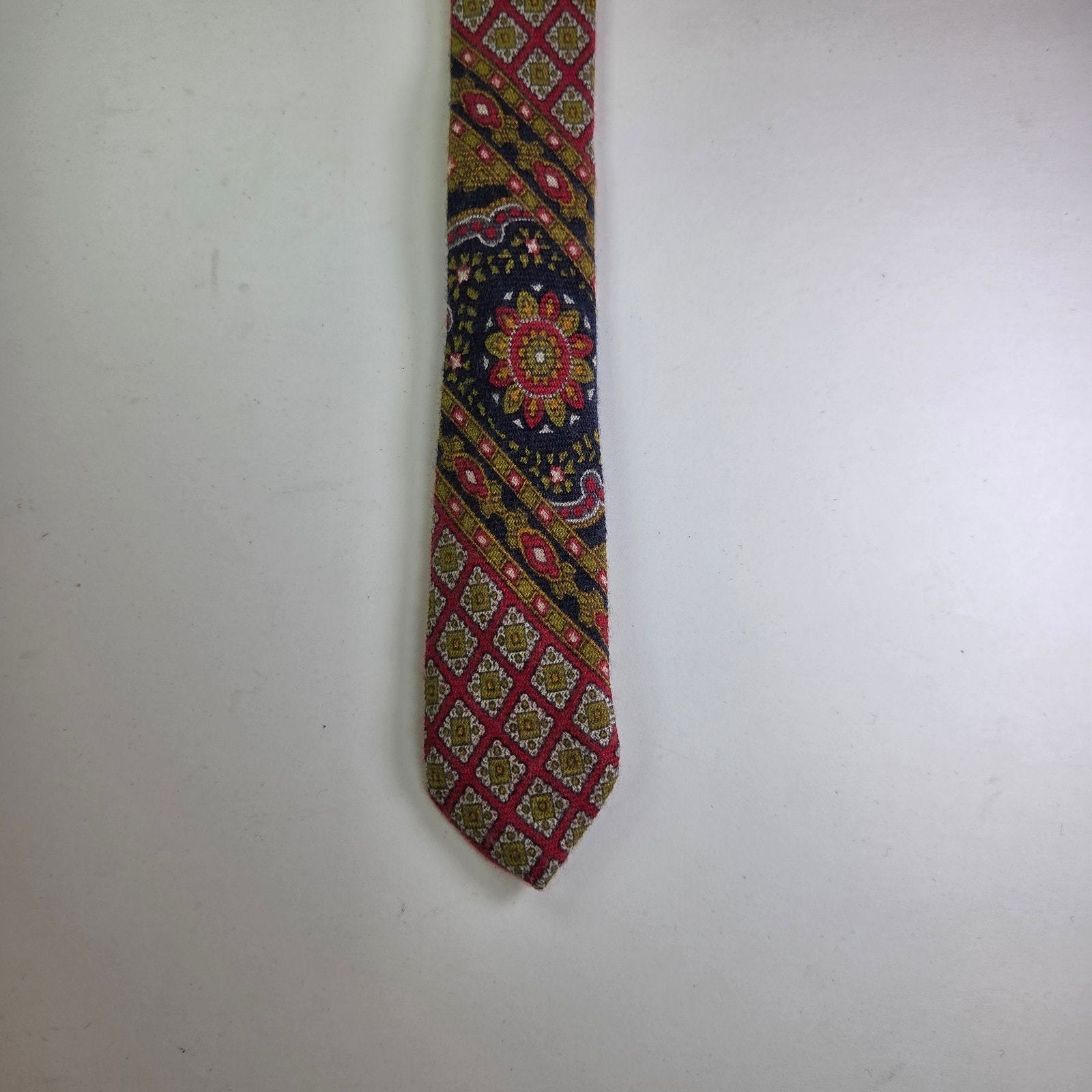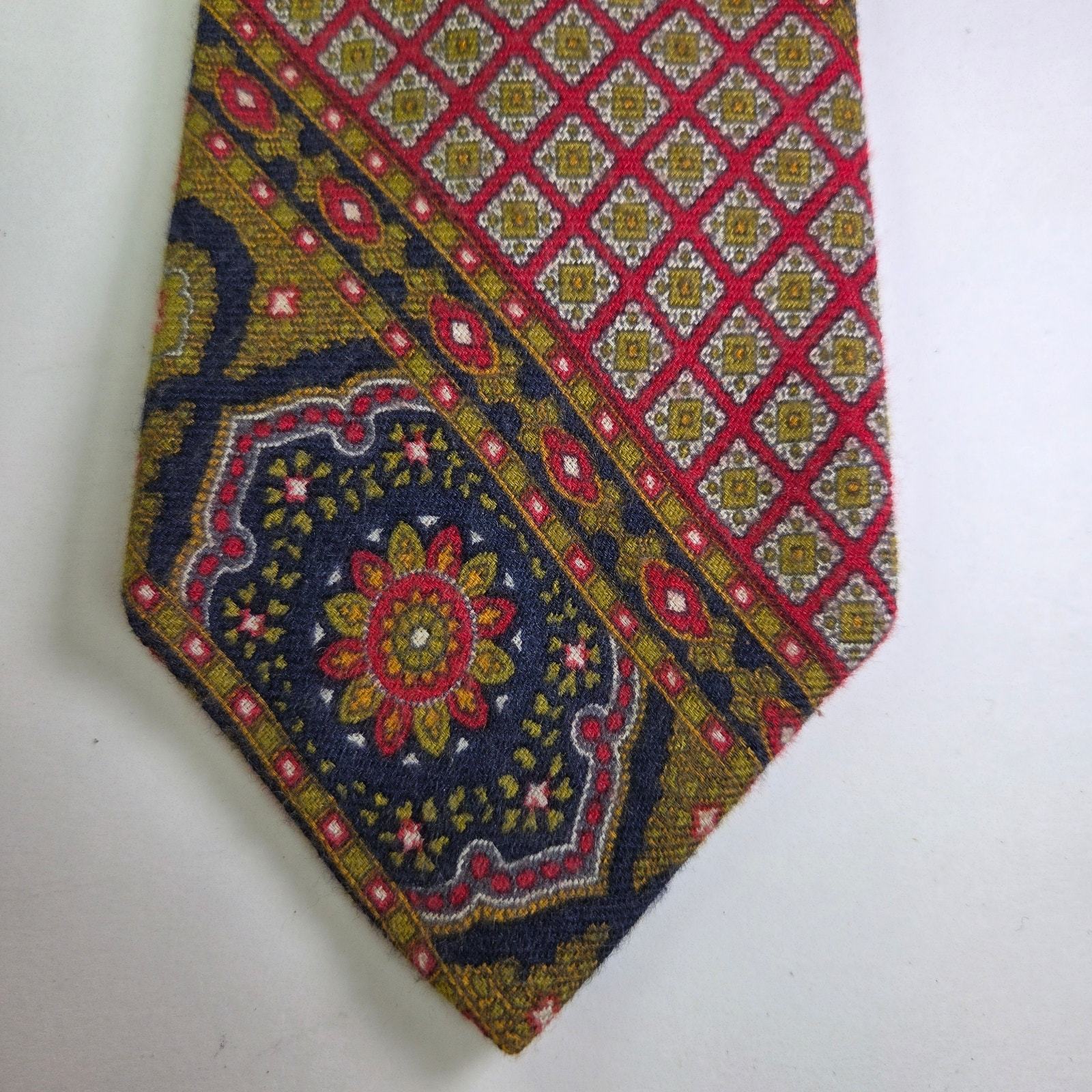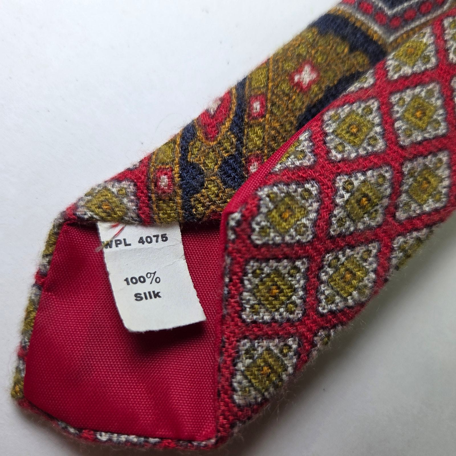 This vintage Resilio tie features a bold geometric pattern in red and gold on a rich navy silk background. Made in the USA from 100% silk, this wide-format tie offers classic styling and quality craftsmanship, perfect for collectors or heritage menswear fans.