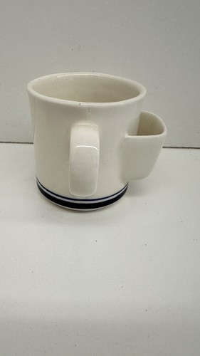 This vintage restaurant ware tea cup mug with bag holder is a unique addition to any collection. The white ceramic and porcelain material is accented with blue stripes, giving it a 1950s style. The round shape and straight line design make it a perfect fit for all occasions, whether it's a casual morning coffee or a formal tea party.