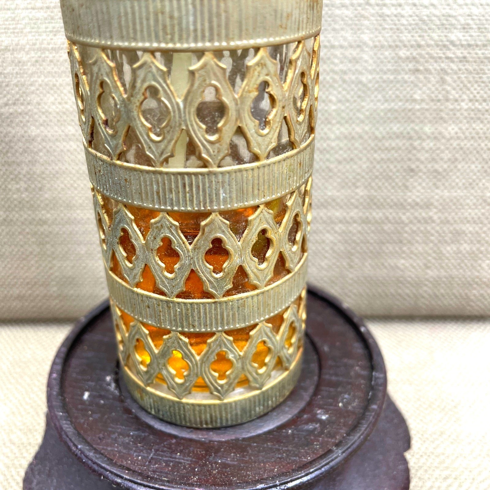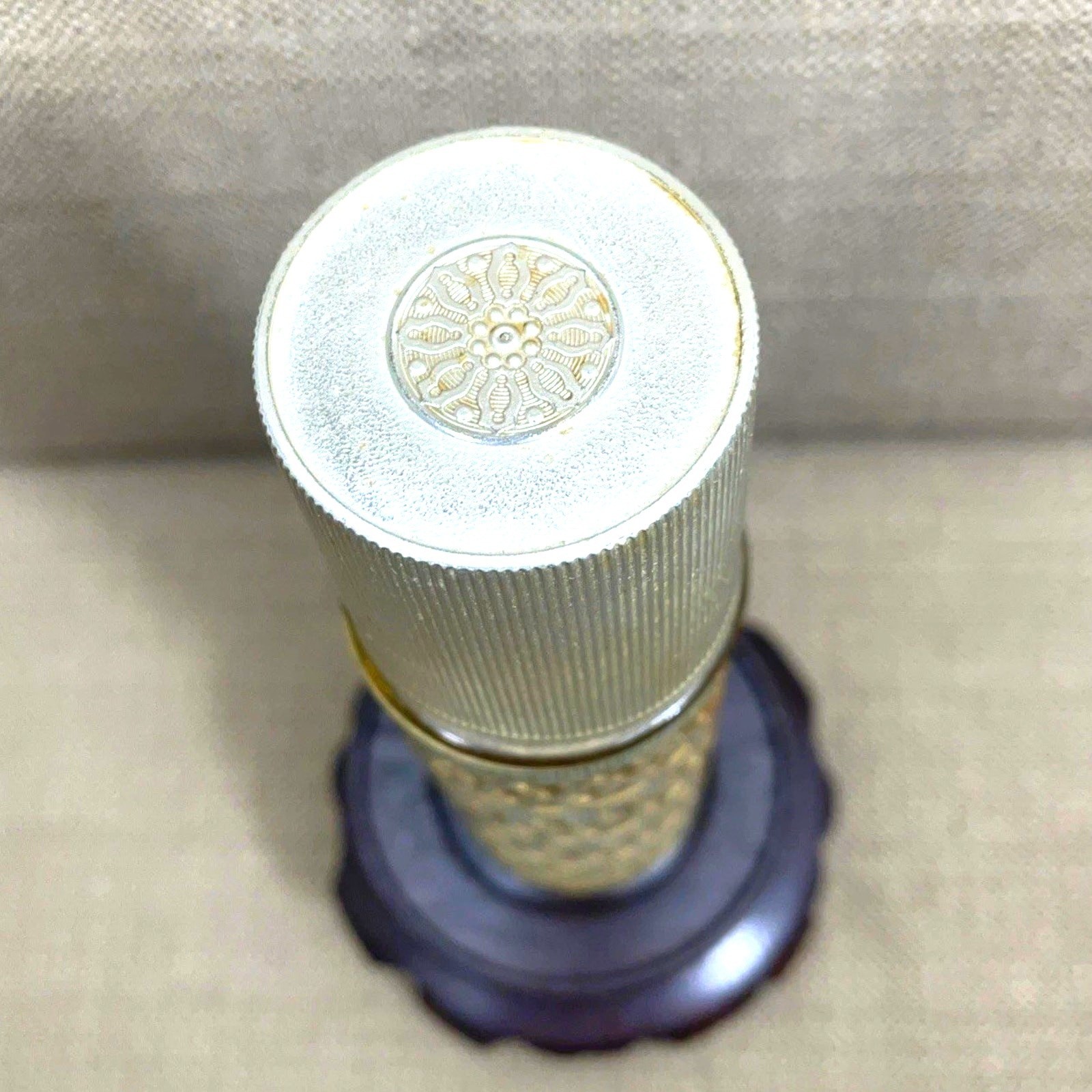 The gold metal case that the glass bottle is in the gold color shows some slight discoloration and the cap shows some wear.